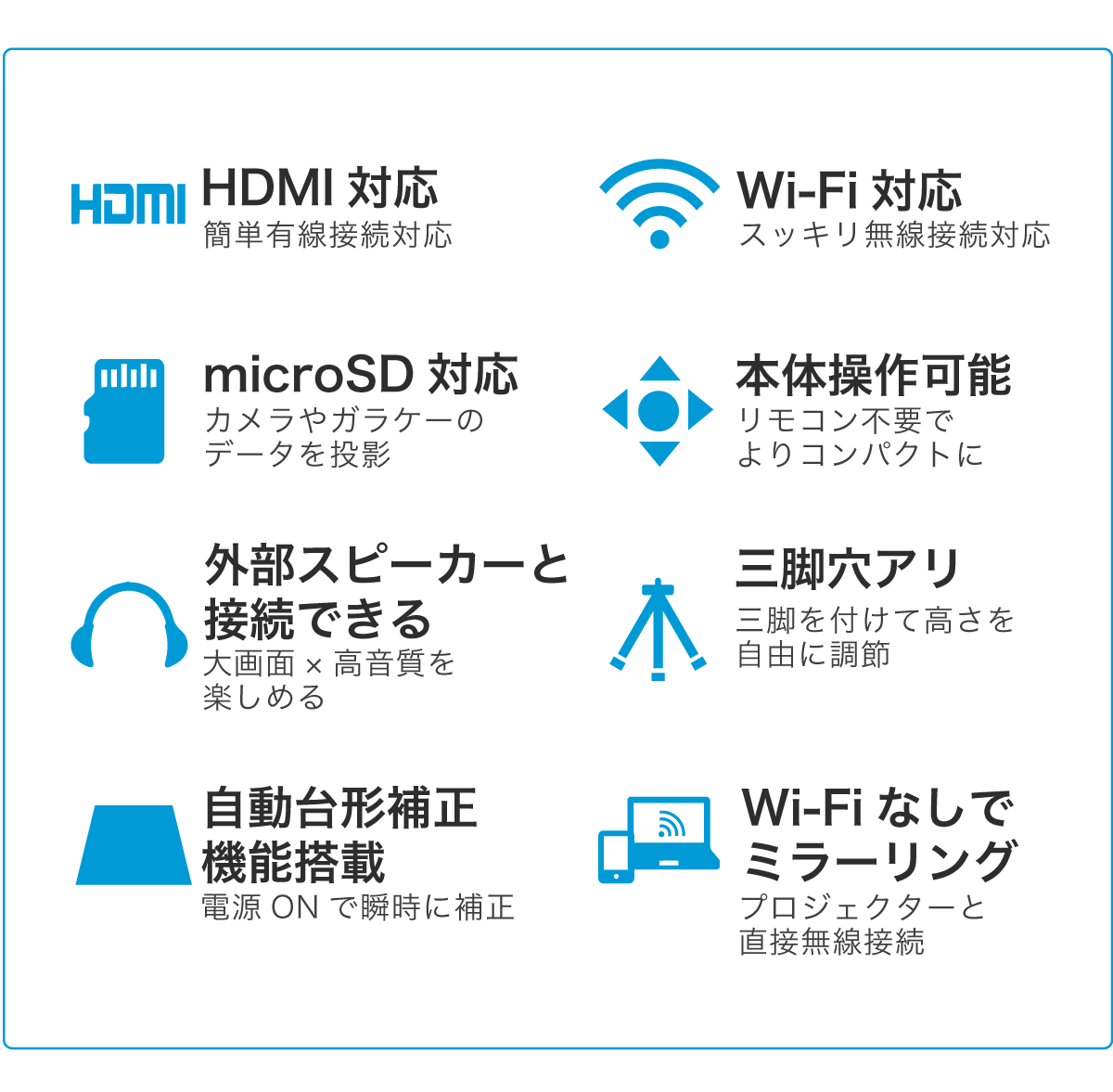 USBやmicroSDも挿さります。さらに自動台形補正・本体操作(リモコンでの遠隔操作も可能)・Wi-Fiなしでのミラーリングも可能なので、本当にこれ一台だけでスイスイ操作ができるんです。
