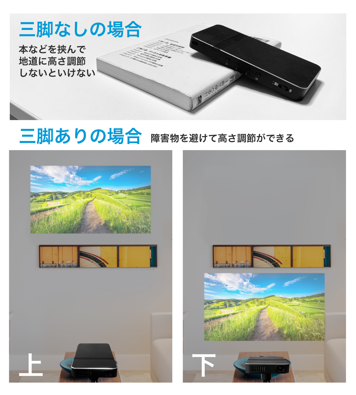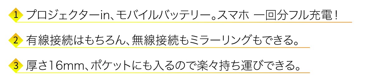 自宅はもちろん、旅行やキャンプなどにも気軽に持っていける大きさですので、いつでもどこでもプロジェクションをお楽しみいただければと思います。