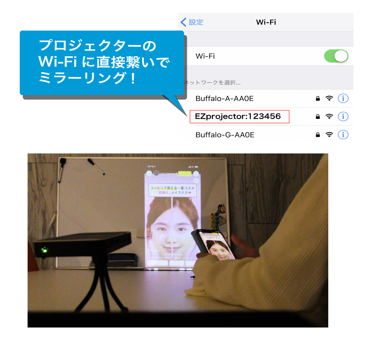 Wi-Fiが無い場所でも、FN-03が飛ばしているWi-Fiに直接接続して、超簡単にミラーリングできます。