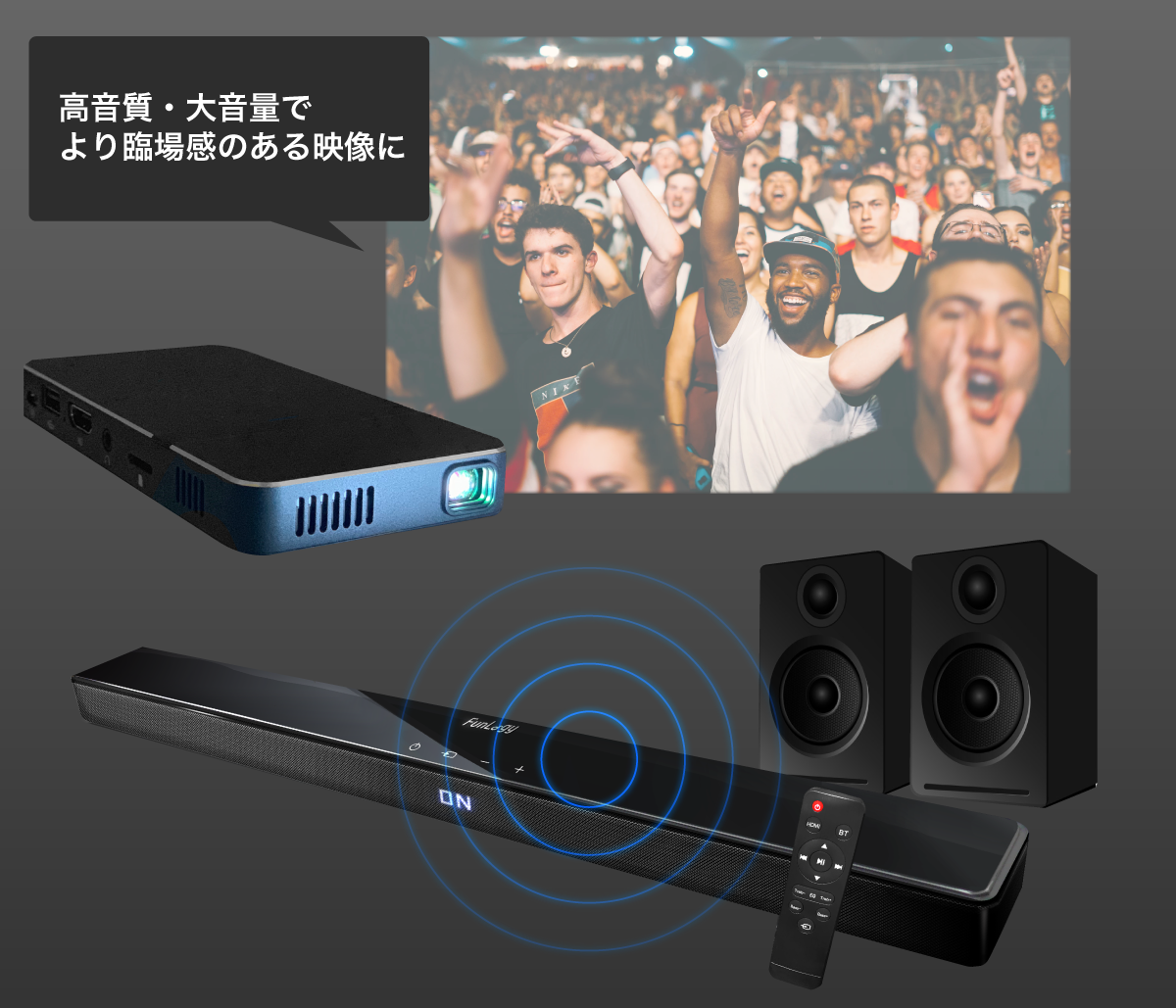 本体にスピーカーが内蔵されているので、これ一台で音も映像も楽しめます。外部オーディオとも