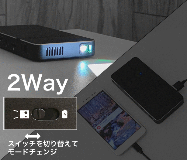 スイッチを切り替えるだけでプロジェクターからモバイルバッテリーに早変わり。