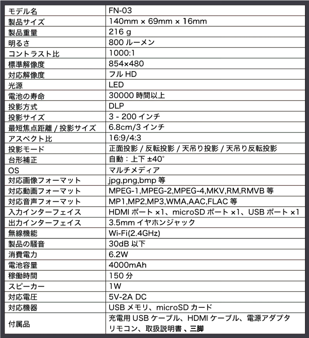 どこにでも持ち運べる、超小型プロジェクターinモバイルバッテリー「FN-03」