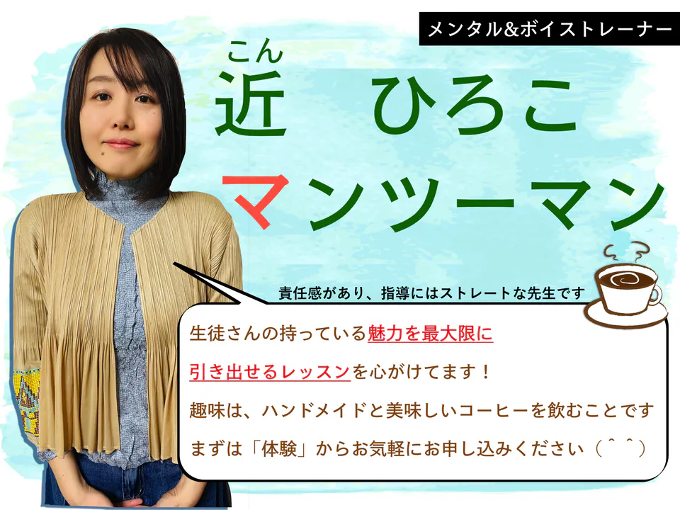 ひろこ先生に、この体験で、様々な声と価値観、悩みを持った生徒さんと出会って、解決の道を試行錯誤していただきたいな、と思います。