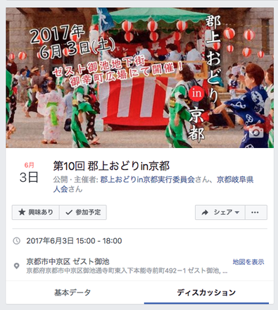 第10回 郡上おどりin京都 イベントページ フェイスブック上に郡上おどりin京都のイベントページを公開しています。 こちらのページで順次イベントの情報を発信していきますので、是非チェックしてみてください。 本日は、今回おどりのメイン会場になるゼスト御池 御幸町広場の様子を伝える動画をアップしました。 イベントに関するご質問などもこちらのページで受け付けています。