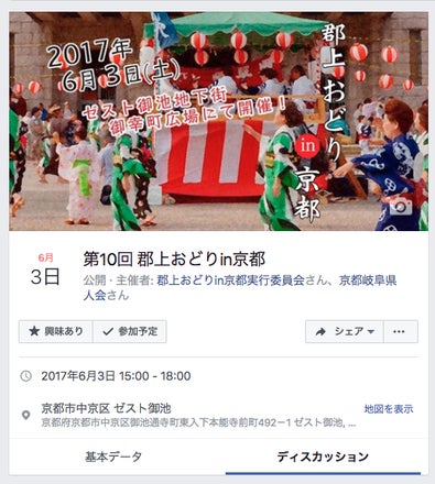フェイスブック上に郡上おどりin京都のイベントページを公開しています。