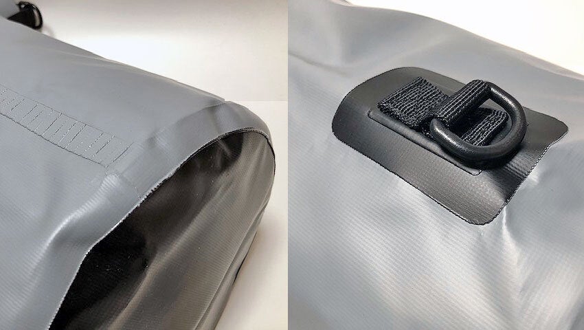厚手のターポリン素材(塩化ビニール)を使用し、パーツの切り返しは圧着式を採用しているため防水効果が高いです。