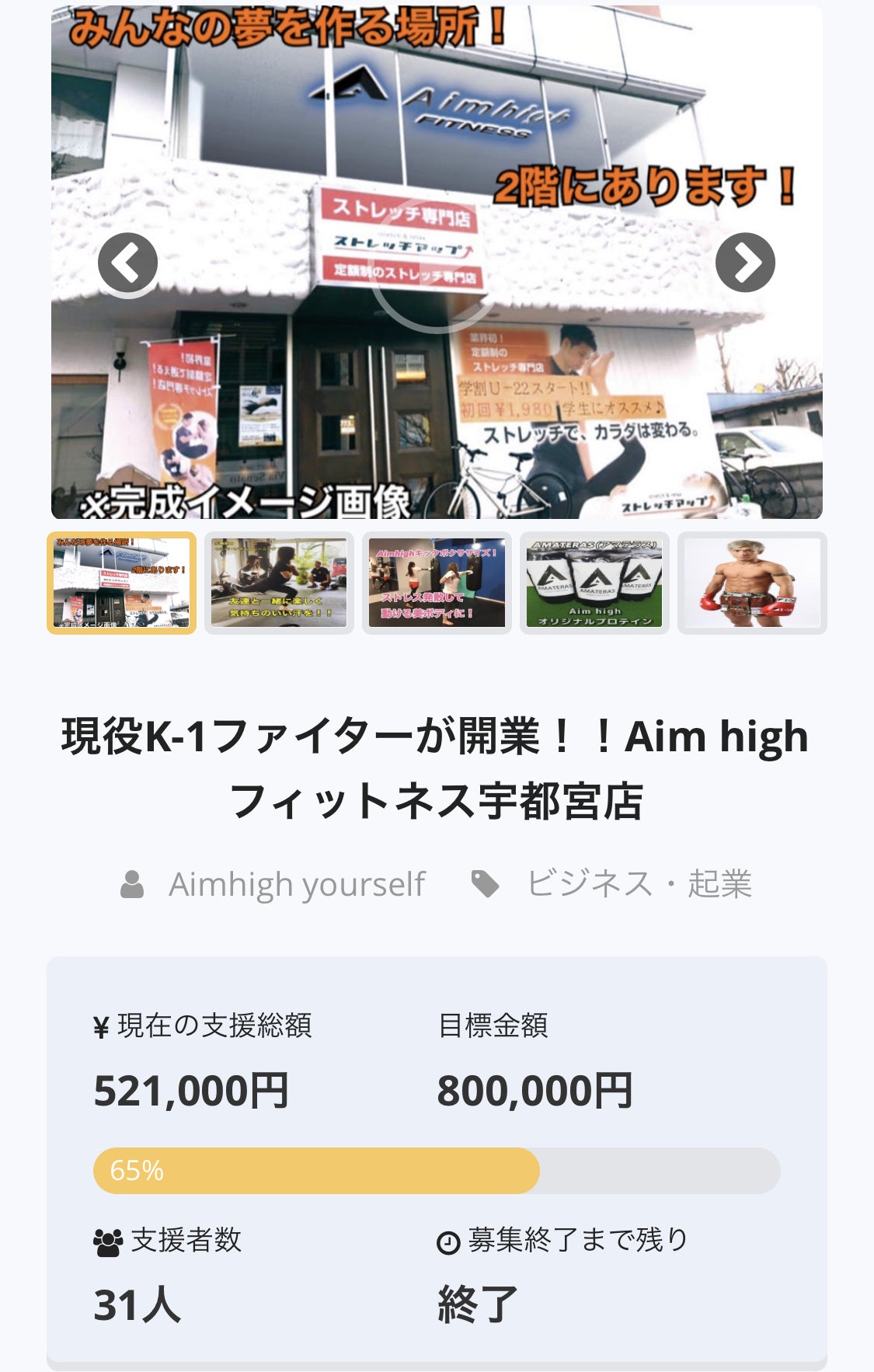 2020/04/16 01:103月4日からクラウドファンディングを開始をして昨日の4月15日で募集終了となりました!たくさんのご支援、ありがとうございました。支援していただいた皆様にはお礼のメッセージとリターンの履行をしていきたいと思います!ここから、更に気を引き締めてやっていきます!暗いニュースが続く不況な時だからこそ!こんな時だかこそ明るい気持ちを忘れずに前向きに突き進むことが元気になるための手段だと思います!運動をするとでストレス発散をして体力と免疫力を付けて強い身体を準備しておきましょう!Aimhigh Fitness 宇都宮 セミパーソナルジムは感染予防対策を徹底し、フィットネスを通して健康で元気な姿にしていきます!必ず!みんな笑顔で乗り切りましょう!そして明るい未来を待ちましょう!喜びが待っています!みんなで分かち合いましょう!みんなを笑顔にして、みんなのためになるジム作り。Aimhighは夢を創る場所。頑張りましょう!ご支援・ご協力、そして温かい応援のメッセージをいただき、誠にありがとうございました!支援金は最高のジム作りのための貴重な資金にさせていただきます。本当にありがとうございます。 もっと見る