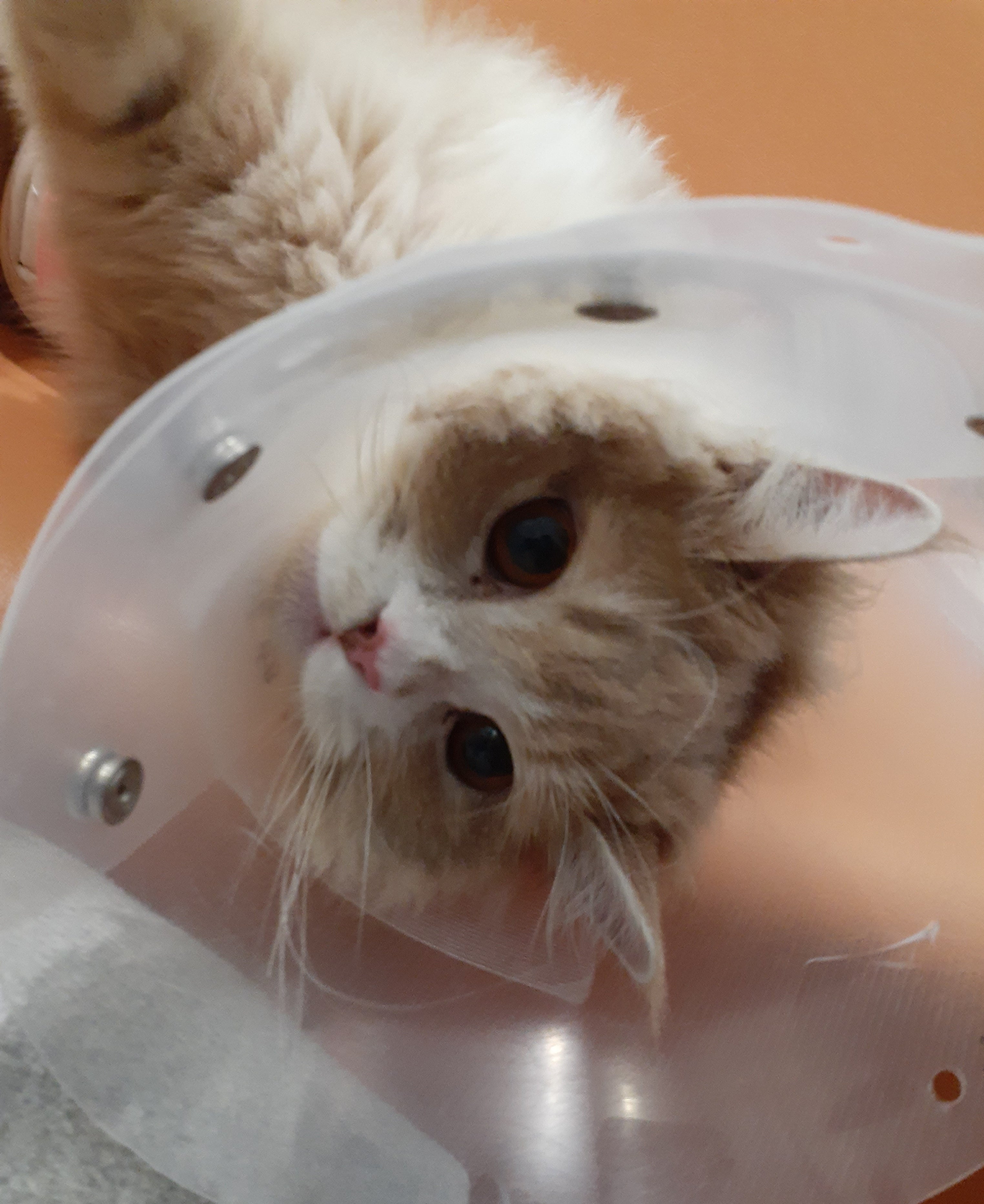 病院へ行ってきました。ハジュは麻酔で眠っていました。昨夜は麻酔で朝まで眠っており、今朝、麻酔の量を少し減らそうとしたところ、また手足をバタつかせ痙攣を起こしそうだったので、再び麻酔の量を戻したそうです。門脈が血流に慣れて神経の暴走が起こらないようになってくれれば良いのですが・・・・。木曜日の夜から何も食べていないので、鼻から胃までチューブを入れ、液状のものを朝、流したそうです。2日以上、食物が流れないと術後の腸や肝臓にもよくないらしく。よく見ると鼻に細い管が入っていました。人間でも胃カメラの管が入った時は、とても苦しく我慢するのが大変なのに。。。。まだ、明日までずっと麻酔で寝かせておき、明日また様子をみるそうです。点滴にはドパミン、硫酸リンゲル液などがかかっていました。他にもあったのですが、それはよくわかりませんでした。一昨日の手術後、麻酔から覚めて丸1日は順調だったのに。普段食べているカリカリを持っていき、さあフードを食べ始めて元の生活へ、という矢先のことでした。先生も1日は大丈夫だったので予想外のことのようでした。祈るしかないです。SNSなどで拡散していただいている皆さま、ご支援や応援をしていただいている皆さま、どうもありがとうございます。なんとか、よい方向へむかってくれるといいです。