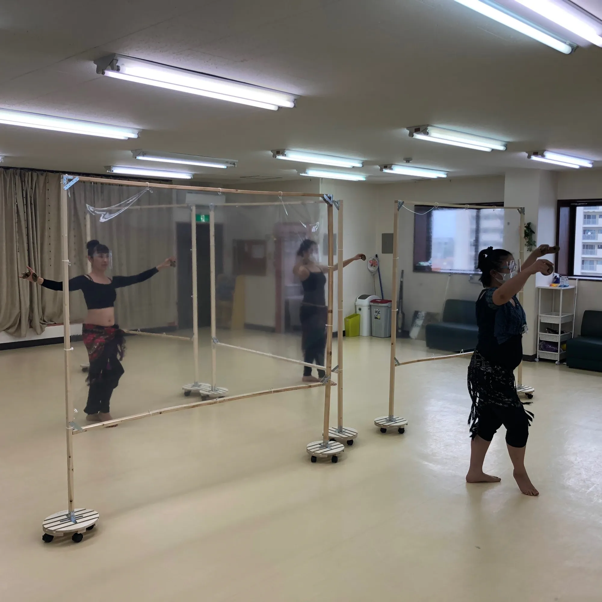 消毒・検温・スタジオへの入場者体調チェック・定期的な換気・飛沫感染防止のための常時フェイスシールドを着用の上、練習に励んでいます。