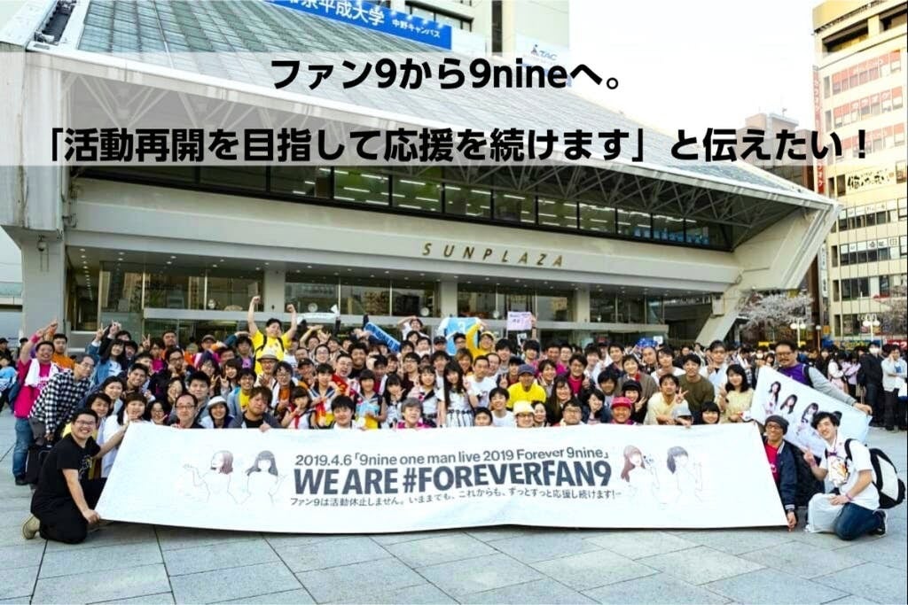 メンバー、スタッフの皆様が、活休からほぼ休まずに個人活動を一生懸命続けてくれているお陰で、わたしたちファン9も、様々な形で集まり、日々彼女たちの活動を応援することができています。しかし、活休開始から1年が経とうとする今、「グループとしてステージに立つ9nineの姿がもう一度見たい」と、メンバーもファン9も強く望んでいることではないかと思います。活動再開に向けて、ファンから何かアクションを起こすことができないかと、ファン9の有志一同でこちらの企画を立ち上げさせていただきました。
