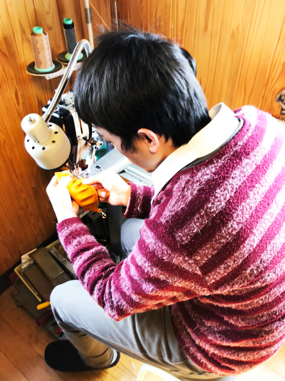革部分は職人の結城春樹が全てハンドメイドで作成。ファスナーの両側の生地も革の色に近づけるため特注で製作。