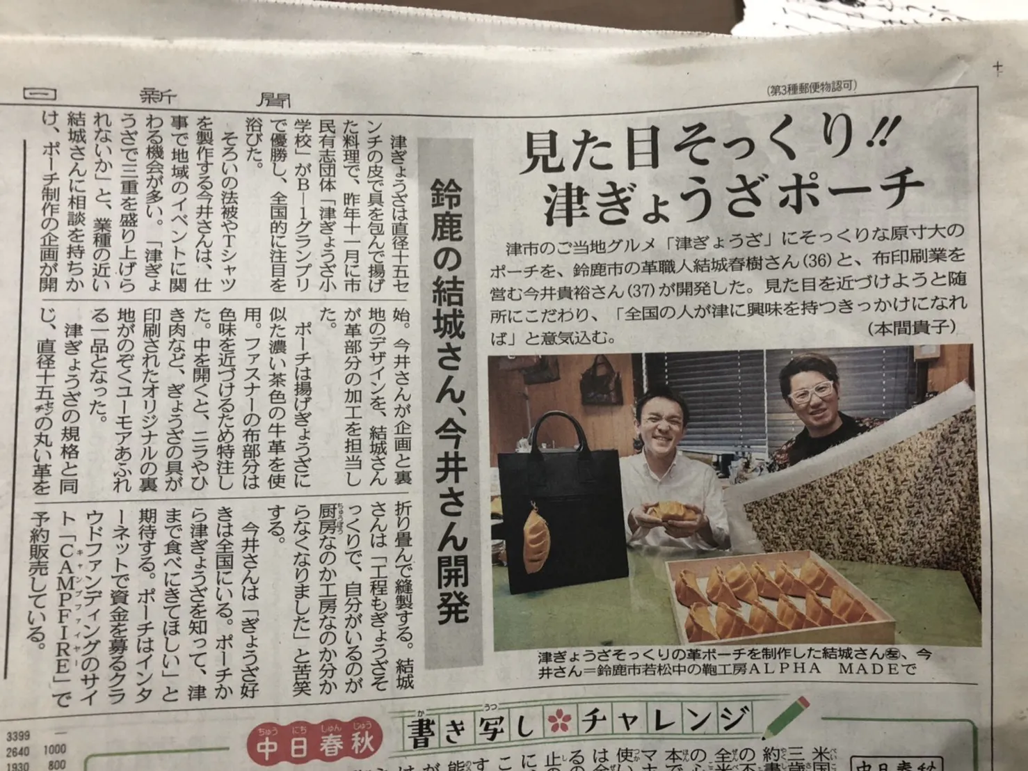 2020/03/24 14:22皆様、ご支援本当にありがとうございます!本日の中日新聞さんの朝刊で、この餃子ポーチを掲載いただきました!記事を見てご支援いただいた方、本当にありがとうございます!なお、キャンプファイヤーのシステムの関係上、ご支援いただいた方の個人情報はすべて、クラウドファンディング期間終了まで伏せられており、直接の知人の方にご支援いただいても、お礼をすぐに言うのが難しい状況になっております。SNSのメッセージなどで「支援したよ~!」とコメントいただけると非常に助かります!あと30日ほどではありますが、このプロジェクトを達成し、次の「地元を盛上げる新たな特産品の開発」をしていきたいと思っています!引き続き応援よろしくお願いします!今井&結城 もっと見る