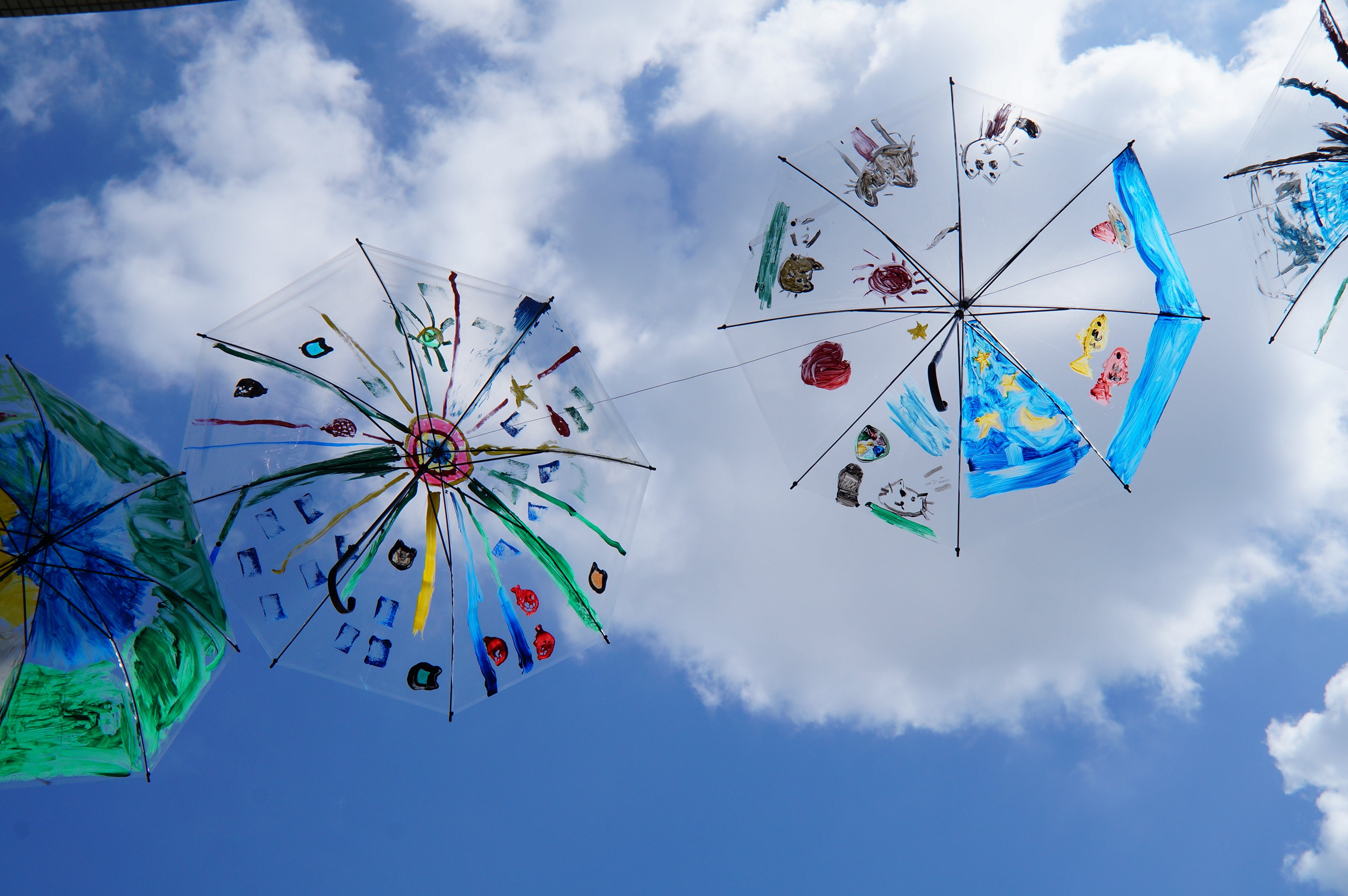 ②子どもたちがお絵かきをした傘、飾り用のビニール傘の設置