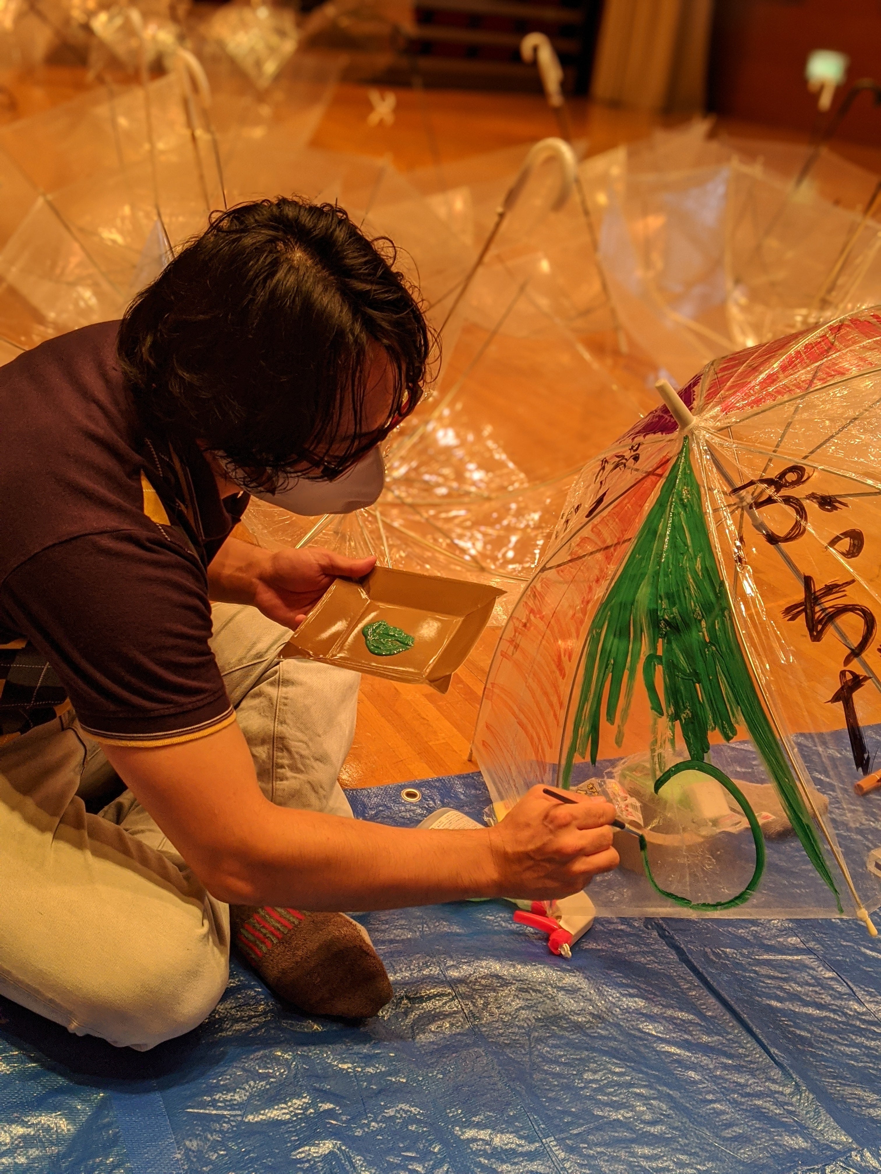 午後からは、ワークショップをお手伝いいただく講師の皆さんにも来ていただき、実際に傘に絵を書いてみます。