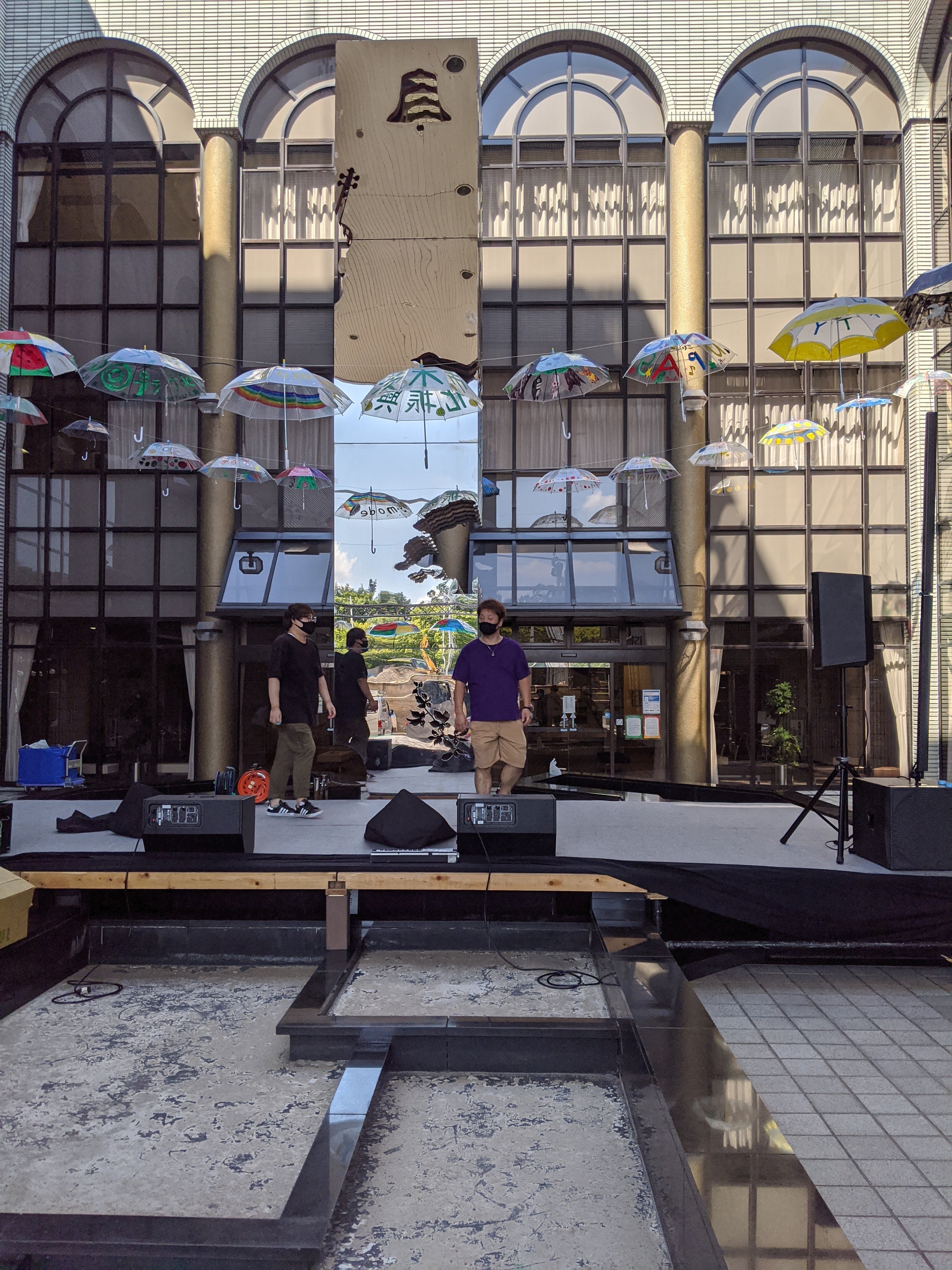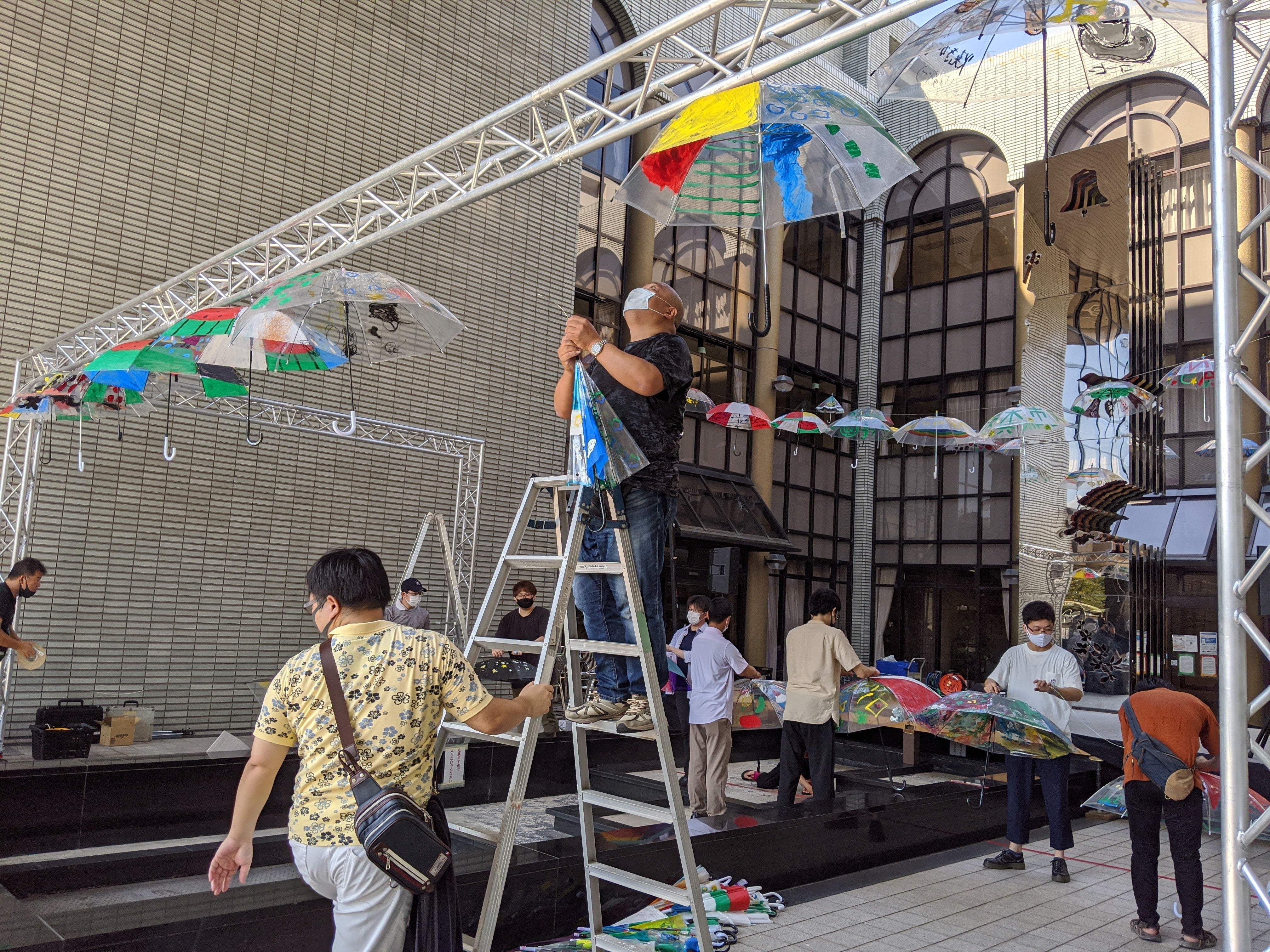 朝からワイヤーを使って傘を吊るし、準備完了!地上に飾ったものも含めると、全部で82本!