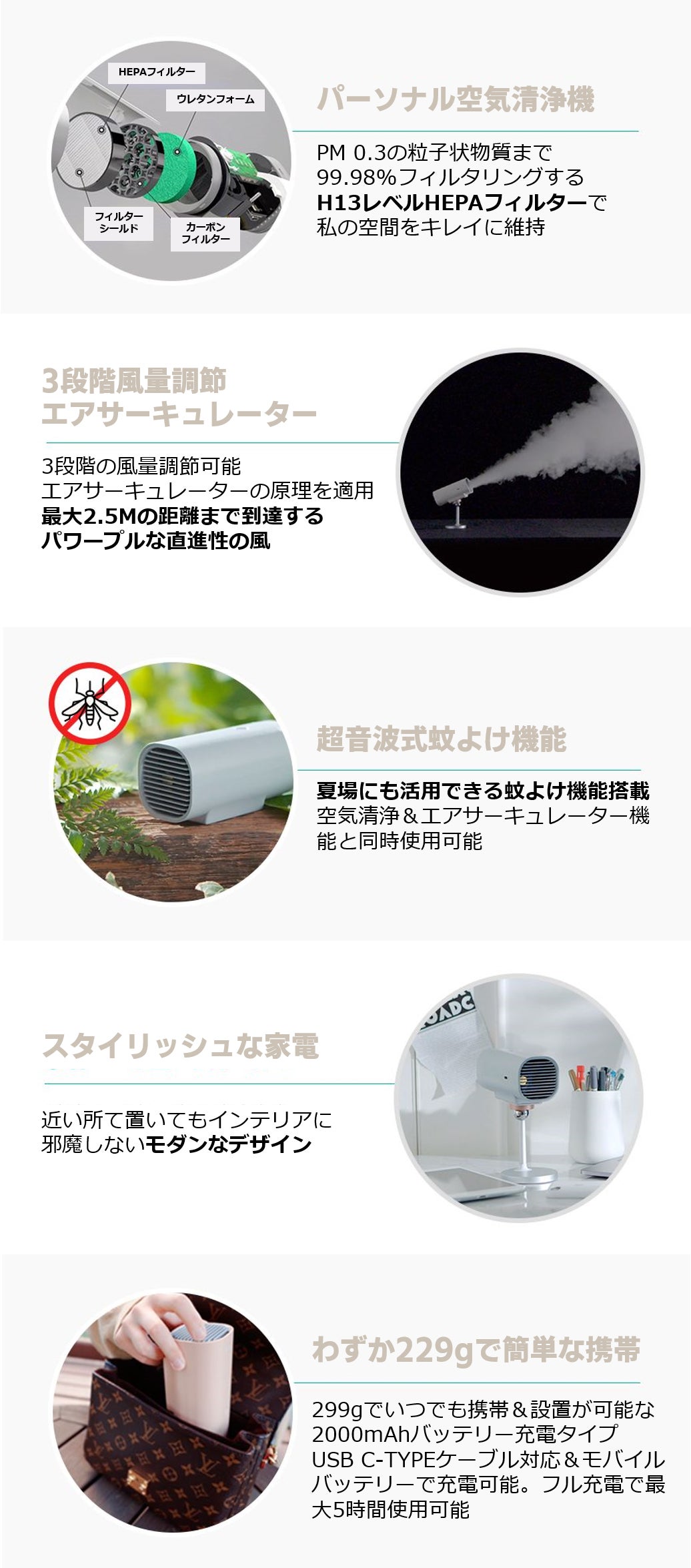 「パーソナル空気清浄機+エアサーキュレーター原理」で私と一番近くの空気を浄化してくれるポータブル空気清浄機の使用をおすすめします。