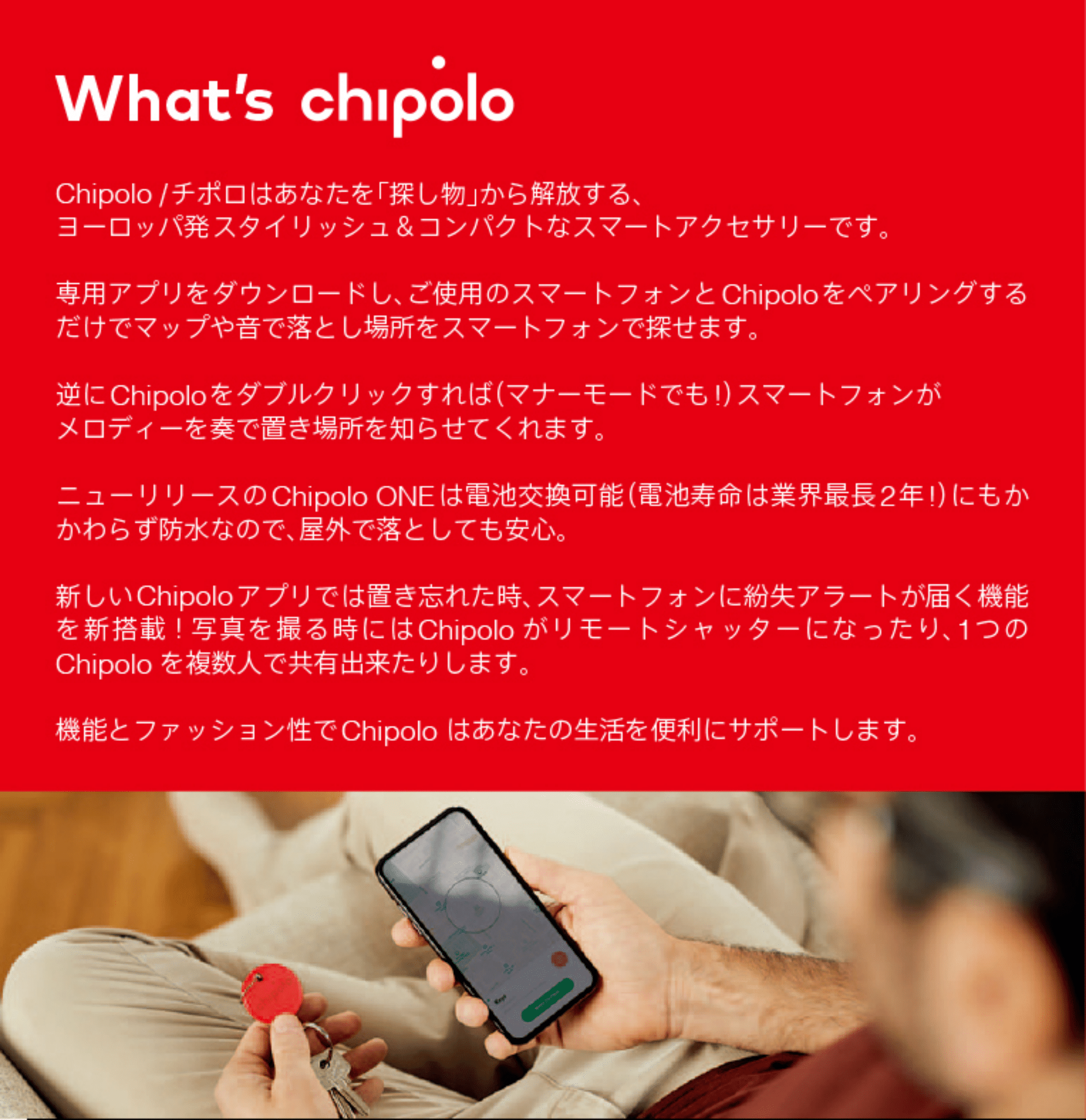 誰もが一度や二度は、自宅や外出先で大切なものが見当たらずにドキッとした経験ありますよね。ヨーロッパ発のスマートアクセサリーChipolo(チポロ)はあなたを「探し物」から解放してくれるスマートアクセサリーです。