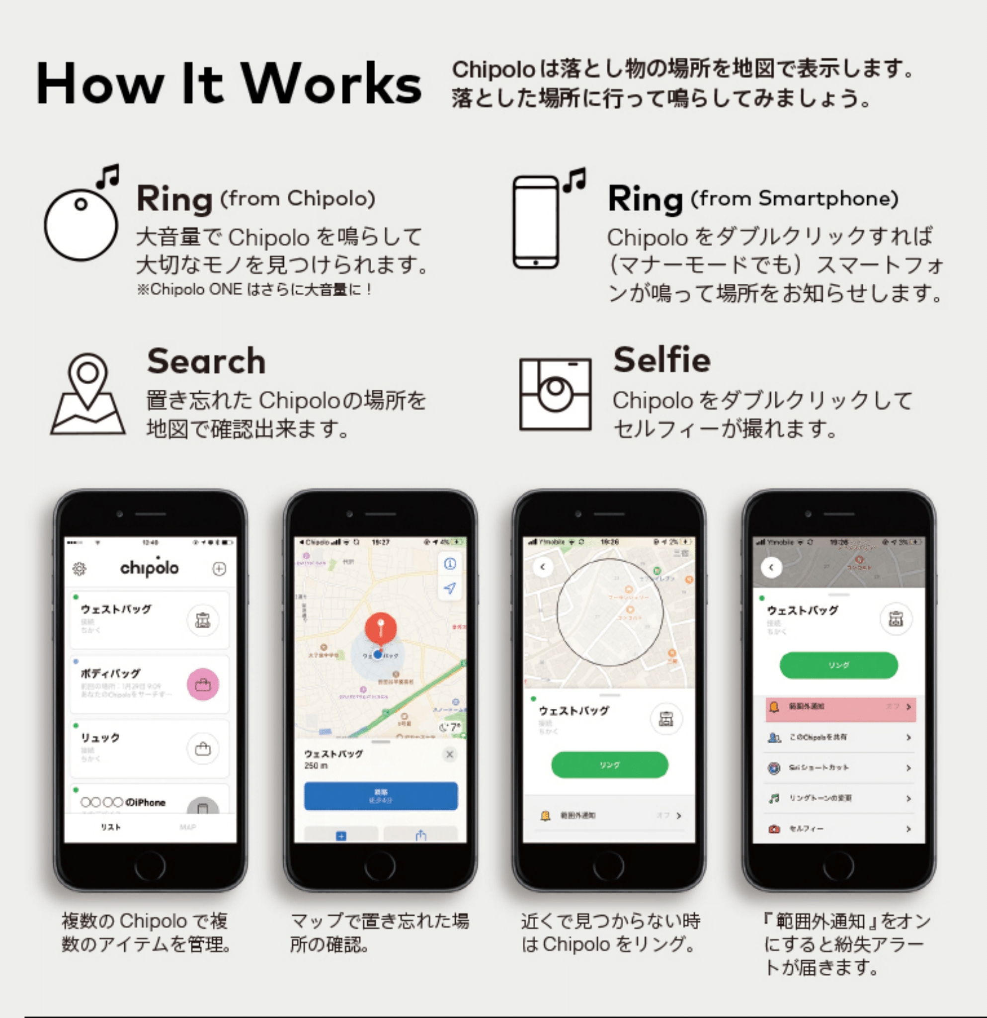 Chipoloはアプリをダウンロードして対象物とペアリングするだけで、音やマップで落とし場所を探してくれるスマートアクセサリーです。