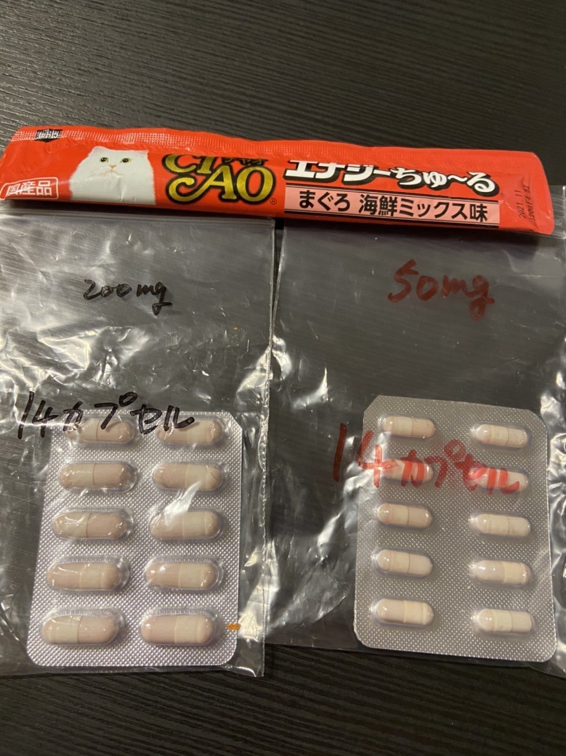 あげ方は200mgのカプセルだと大きいので、カプセルであげずにちゅーるに混ぜてあげています。