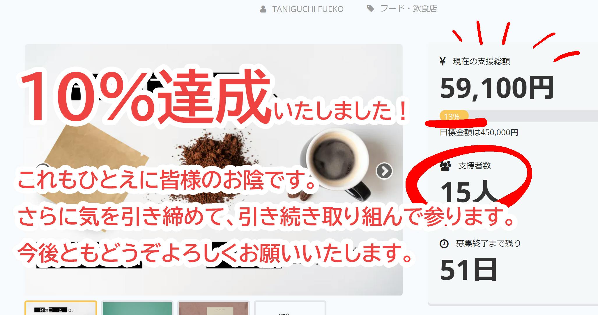 皆さまのお陰で、10%のご支援金額を達成することが出来ました。