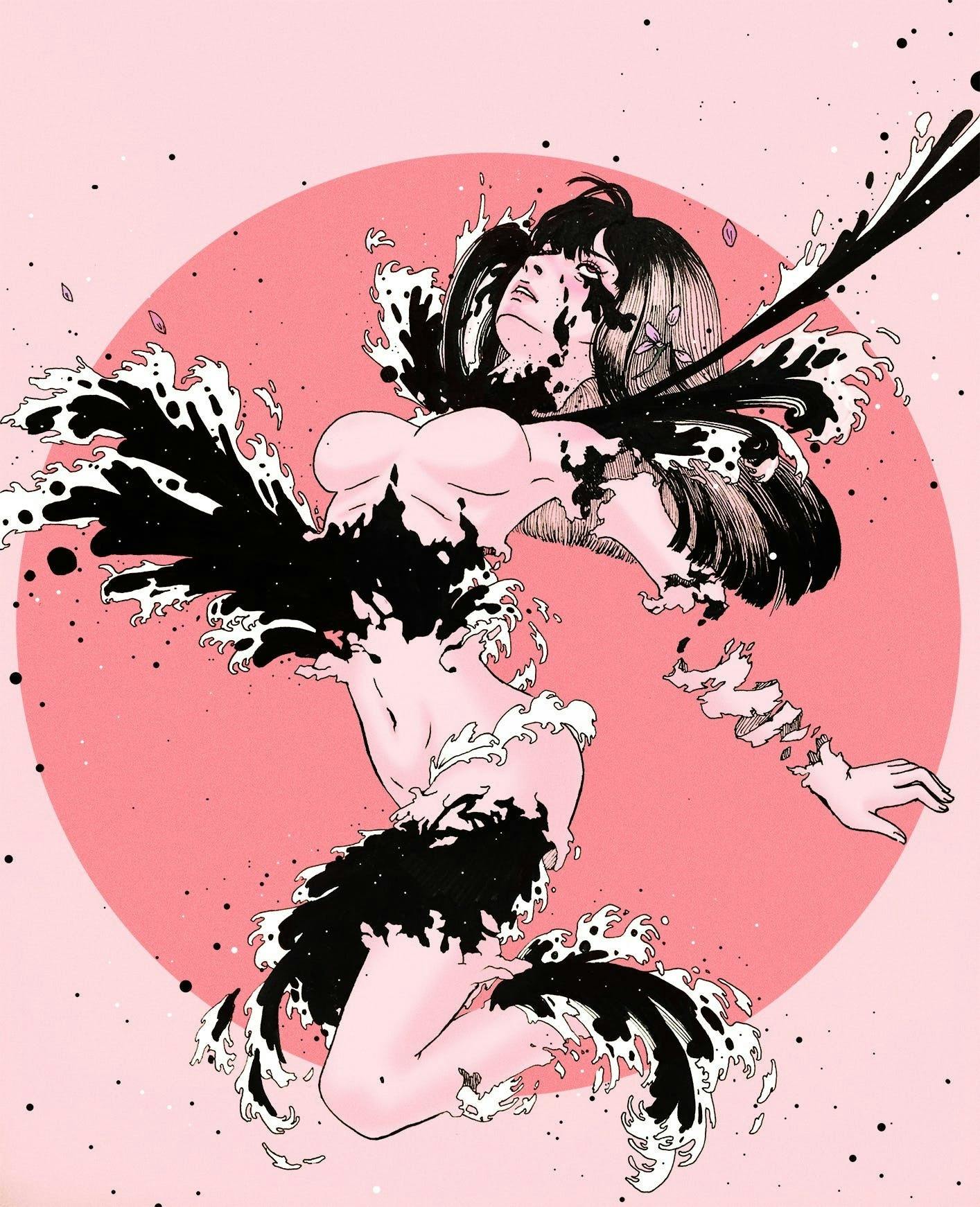 上の絵は私のデビュー作品の「kyrie」です。自分の目の前にある道を歩むことができます。しかしただ置かれたレールに沿って歩む人生は過ごしたくないと思い、それをあらわすかのような絵を描きました。黒いペンと携帯カメラ、フォトショップ。この3つの道具で描いたこの作品があっての「ペガコン」です。