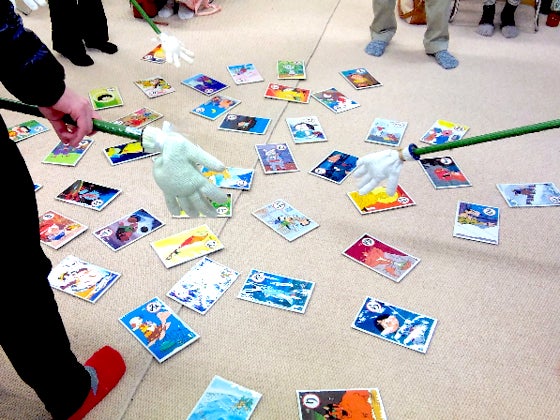 絵札はありませんでしたが、(あ)(い)(う)とだけ書いた札を置いてカルタ遊びをしました。