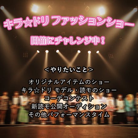 2017/04/18 13:22プロジェクトがサクセスしたらファッションショーを8月21日に開催します プロジェクトに参加してる8名の予定や、なるべくたくさんの小中学生に見てもらえる日程という事で、プロジェクトがサクセスした場合のファッションショー開催日程は、夏休み後半の8月21日(月)に決めました。 場所は、都内の会場でキラ☆ドリらしい楽しいショーが出来る場所を調査しているところです。 ショーでやりたい事 現在候補にあがっている、ファッションショーでやりたい事を発表します。 ・オリジナルアイテムのショー プロジェクト参加の8名でデザインしたオリジナルアイテムのショーです。デザインしたTシャツを、8名がそれぞれの個性を生かしたコーディネートでランウェイを歩きます。 ・キラ☆ドリ モデル・読モのショー キラ☆ドリ イメージキャラクター、読モによるファッションショーです。これを機会にキラ☆ドリのファッションショーを定期的に開催していきたいと思っています。 ・コーデコンテスト 一般の方が参加出来るコーデコンテストです。いろいろな賞を用意します。入賞者はWEBマガジン「キラ☆ドリ」内で紹介させていただきます。 ・新読モ公開オーディション キラ☆ドリでは、春休みと夏休みの毎年2回読モを募集していますが、ショーが開催されたら一緒に公開オーディションも開催します。 上の写真は、2015年の夏に開催された公開オーディションの様子です。たくさんのお友達がチャレンジをしてくれました。 ・その他パフォーマンスタイム キラ☆ドリには、ダンスが得意な子、楽器が得意な子、アイドルユニットに所属している子など、いろんなパフォーマーがいます。それぞれが得意なパフォーマンスを披露して、ショーを盛り上げてもらいたいです。 オリジナルアイテムについて 現在、各チームともデザインの最終調整に入っています。デザインが決定したら発表します。もう少し、お待ちください。 もっと見る