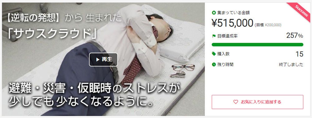 2020/04/15 20:37プロジェクト終了まで、残り4時間となりました。ご支援者様、閲覧してくださっている皆様、 誠にありがとうございます。「サウスクラウド」「グッドナップピロー」のご購入はこれがラストチャンスです!緊急時に備えて、ご自宅や職場に備蓄したり。車に積んでおいて、自宅に帰れない時などに、横になれるように。「もしも」を考えて備えておくと安心です。★大切な人が、防災や災害などの緊急時やどんなシーンでも「眠れる幸せ」を。 人生の3分の1は眠りと言われています。毎日眠るのは当たり前のことですが、時に眠る環境や時間は異なります。今この文章を読んでくださっている間にも、世界中で台風や大雨による災害や大きな地震が起こっています。私たちも東日本大震災を経験しましたが、まさか自分が生きているうちにあのような経験をするとは思っていませんでした。多くの人が「自分だけは大丈夫」と思って過ごしてきたと思います。私たちもそうでした。しかし今、この「自分だけは大丈夫」が通じません。だから、もしもの時の一筋の光となりたい。一つでも多くの「あってよかった」のために。 もっと見る