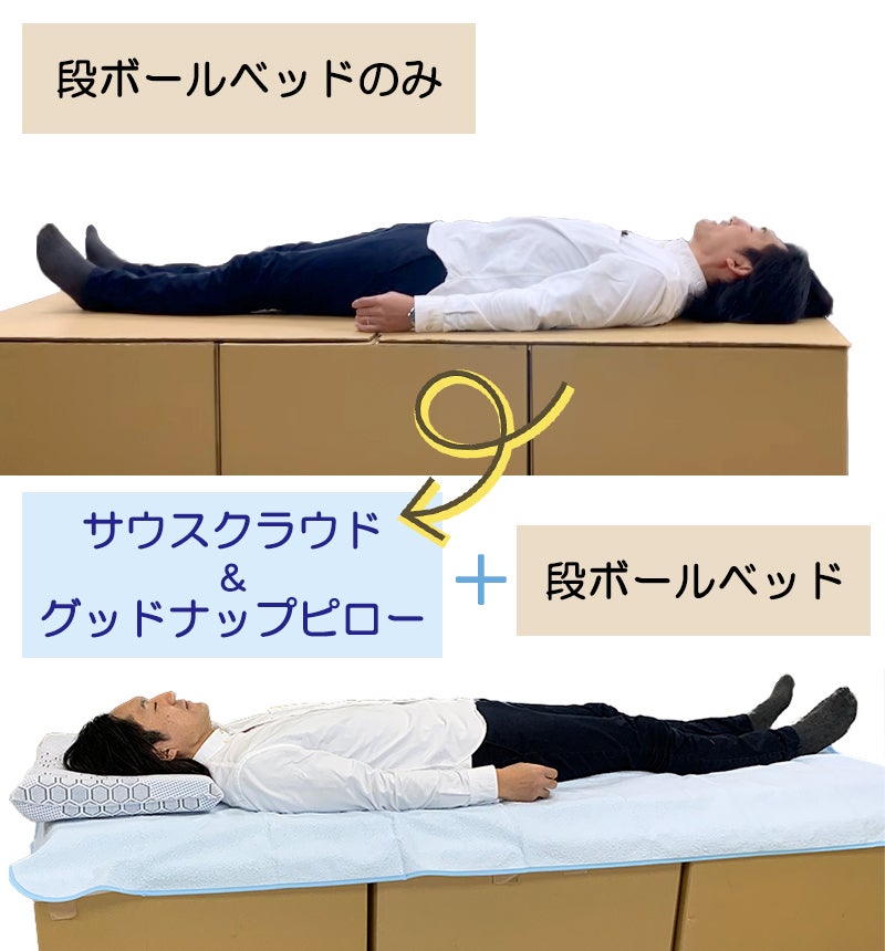 2020/04/08 18:55前回は「段ボールベッドとサウスクラウドを組み合わせるまで」の動画をお届けしました。今回は、・「段ボールベッドのみ」で寝た場合・「サウスクラウド&グッドナップピロー+段ボールベッド」で寝た場合をご紹介いたします。まずは、「段ボールベッドのみ」で寝た場合です。腰や首に負担がかかって苦しげな表情です・・・。腰が反ってしまい、このまま寝るにはつらい姿勢です。次に、「サウスクラウド&グッドナップピロー+段ボールベッド」で寝た場合です。サウスクラウドを敷いたおかげで、心なしかリラックスした表情です!2種類のウレタン素材が体に合わせた「3つのゾーン」に分かれているので、上半身・腰部分・足部分をやさしく受け止めます。好みの高さで使い分けることができるグッドナップピローで、首の負担も軽減。(写真では、「低め」の向きで使用しています。)今回の「超早割」と「早割」は①マットレス「サウスクラウド」②ピロー「グッドナップピロー」③「収納バッグ」 の【3点セット】です!緊急時に備えて、ご自宅や職場に備蓄したり。車に積んでおいて、自宅に帰れない時などに、横になれるように。「もしも」を考えて備えておくと安心です。 もっと見る
