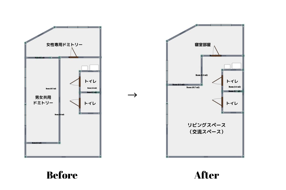 男女共用ドミトリーの方はリビングスペースとの壁をなくし、「交流できる場」と「寝れる場所」に変更します。