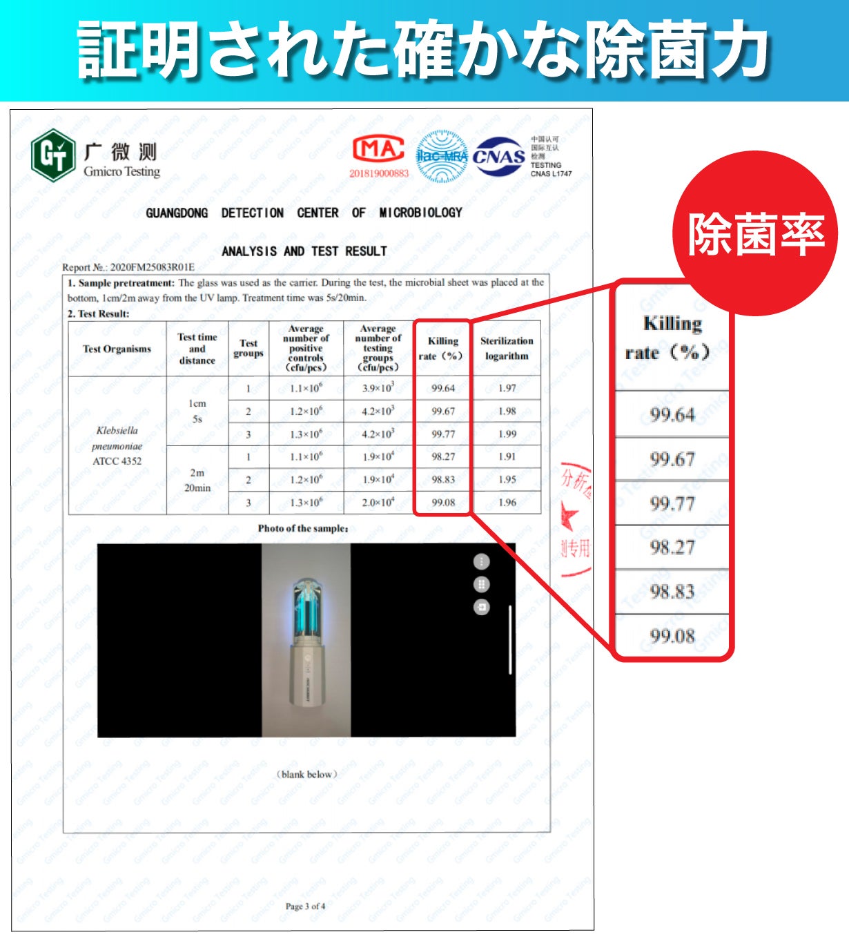 はい、第三者機関によって証明されたテスト結果があります。近い距離だけでなく、2m離れた距離でも除菌できるという結果は他の製品ではあまり示されていない結果かと思います。
