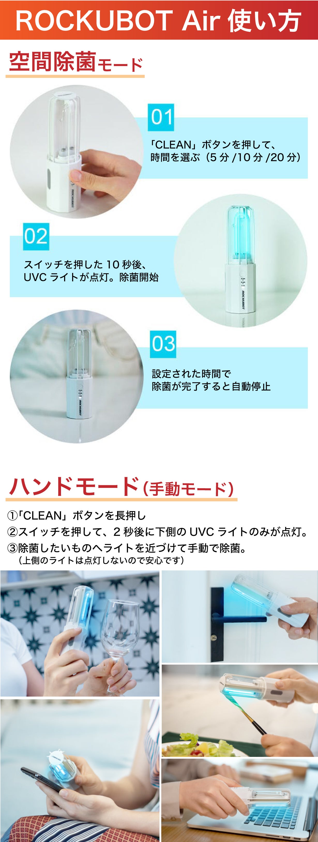 ROCKUBOT Airのアイデアは、ROCKUBOTメーカーCEOが1日旅行しているときに思いついたものです。周囲をより安全に除菌する方法が必要だと感じました。彼らは市場を調査するために何ヶ月も費やし、市場にあるものとは違うものを作ることを決心しました。そこで、持ち運びが簡単で、使いやすいUVCライトを思いつきました。