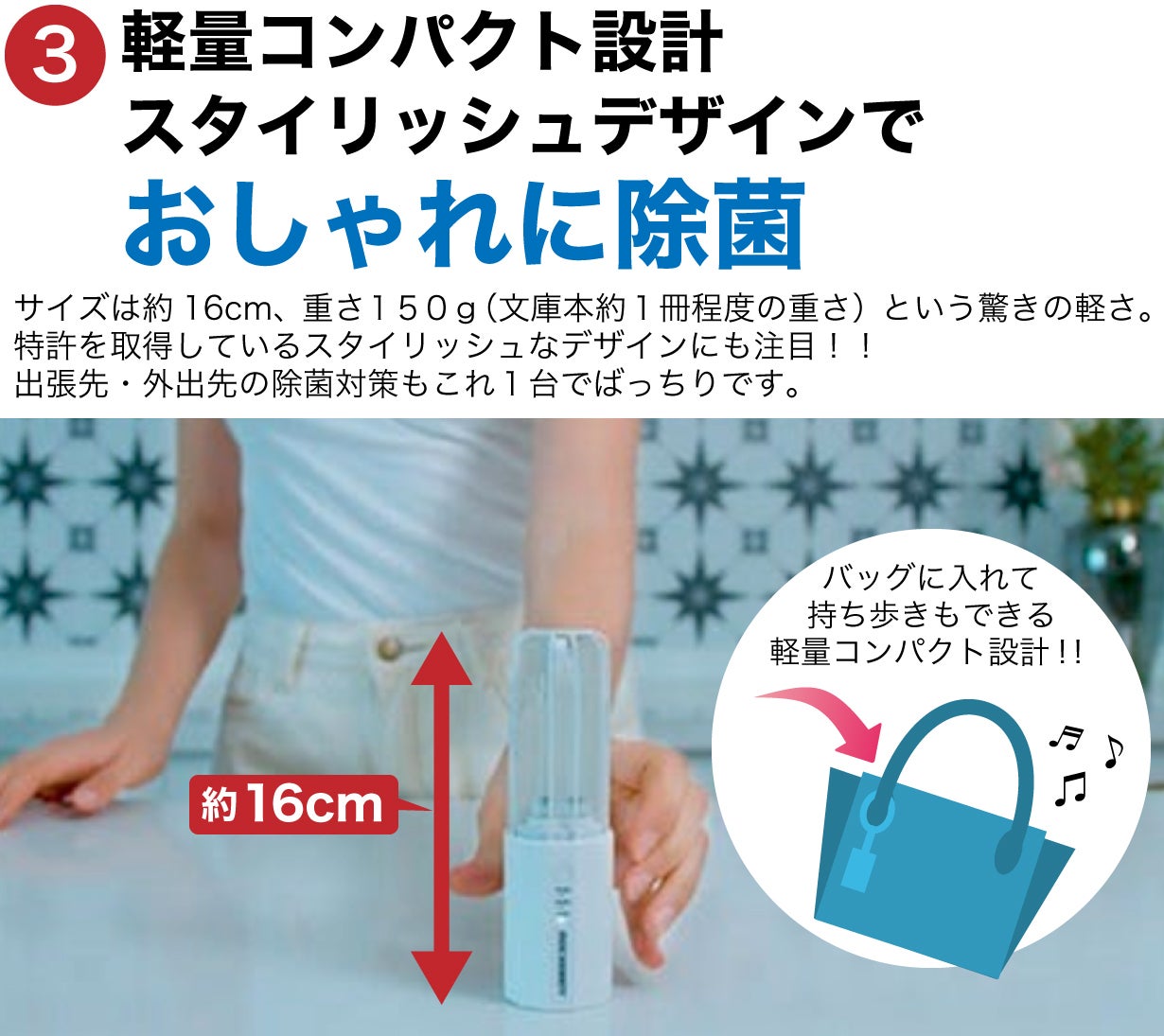 A,サイズは約16cm、重さ150gの軽量コンパクト設計です。