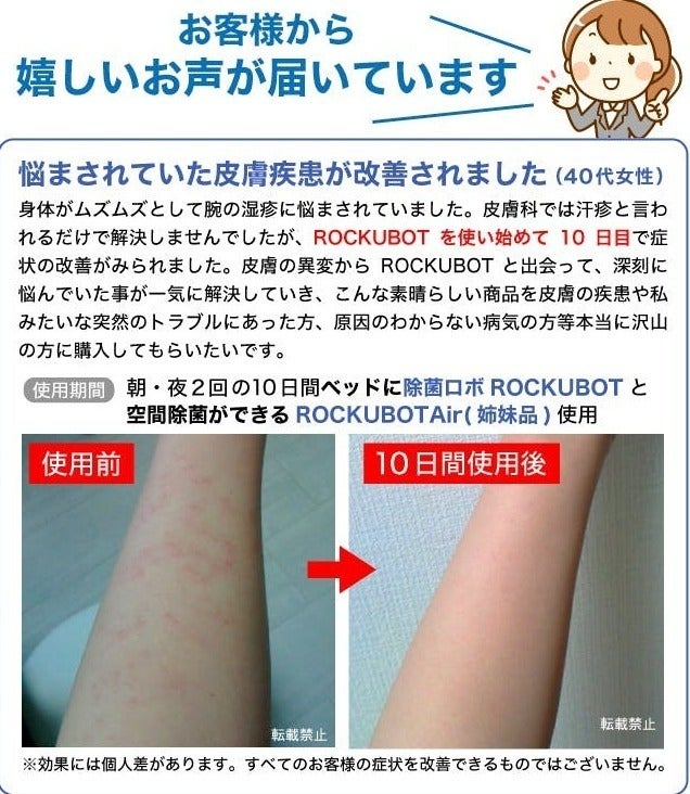 2021/07/02 08:15皆様、ご無沙汰しております。ROKUBOTAirの姉妹品、除菌ロボットROCKUBOT、おかげさまで発売から1年が過ぎました。一時はなかなか生産が追い付かずに、お届けまでかなりお待たせしてしまいましたが、1年経過しようやく生産体制が整い、安定して商品をお届けできるようになりましたので、よりロックボット商品を広めるべく再度プロジェクトの実施を決めました。セールでも出せないお安い価格にてご用意させて頂きました。除菌ロボROCKUBOT→https://camp-fire.jp/projects/view/436088空間除菌ができるROCKUBOTAIr→https://camp-fire.jp/projects/view/439463姉妹品の空間除菌ができるROCKUBOTAirも同時に開催中でございます。今回はよりお得な企業割10個セットもご用意しております。(最大40%OFF1個当たり5940円)すでにプロジェクトは昨日より開始しており、7月30日までの期間限定・数量限定です。正直、これだけお安い価格で販売できるのはこれで最後の機会になると思います。この1年で、商品に対する更なる検証を重ね、ダニに対する増殖抑制効果・新型コロナウイルスに対する効果が認められております。また画像のように、お客様から「原因不明の皮膚疾患が改善された」との嬉しいお声も頂いております。おかげさまでホテル・クリニック・保育園でも使って頂いております。一人でも多くの方へよりROCKUBOT商品を広めるべく、この1か月間頑張っていきたいと思います。よければ最新の検証結果なども載せておりますので、のぞいて頂ければ幸いでございます。お布団が干せなくてもROCKUBOTでお布団ケアをして頂けると気持ちよく寝ることができます。無料ラッピングもしておりますので、出産祝い・誕生日祝いなど大切な方へのギフトへもおすすめです。何か商品に対する不具合などございましたら、お気軽にお問い合わせください。今後とも何卒よろしくお願い申し上げます。株式会社EGLOKINAWA 物販プロジェクトチーム一同 もっと見る