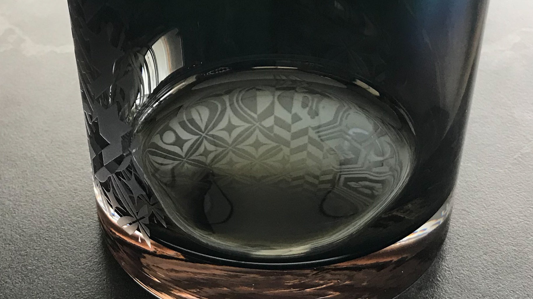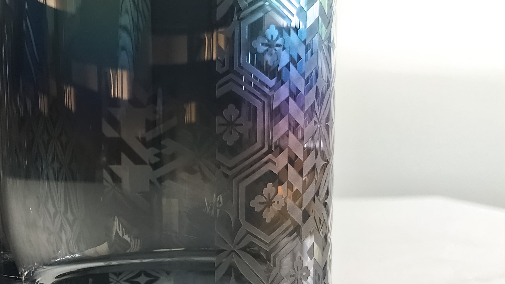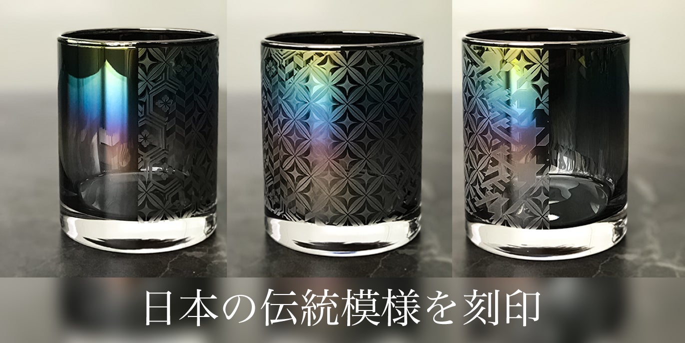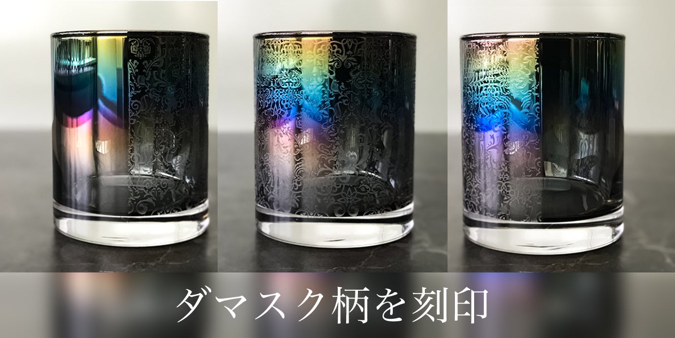 チタンコーティングのロックグラス に、職人がデザインを刻印した、クラウドファンディング限定仕様です。つるりとしたガラス面と、刻印の陰影。アシンメトリーな仕上がりをお楽しいただけます。