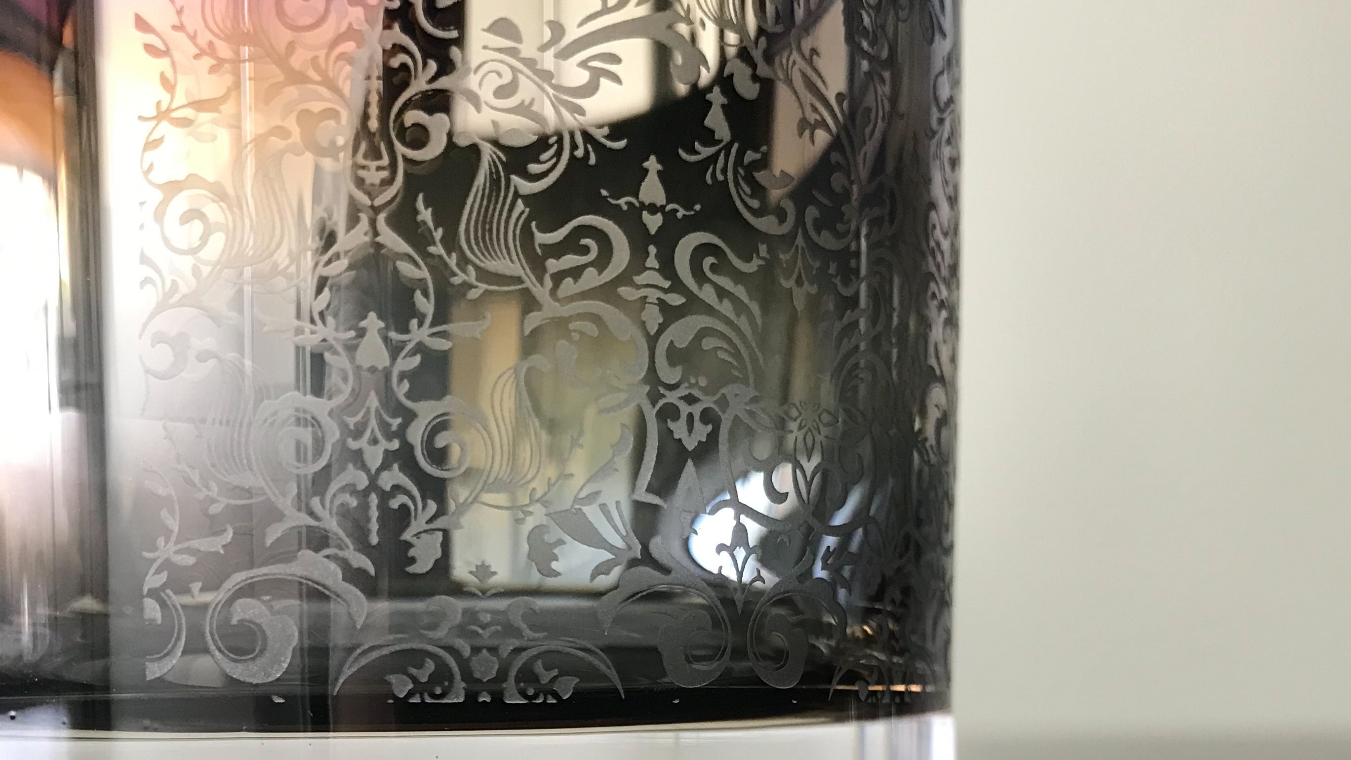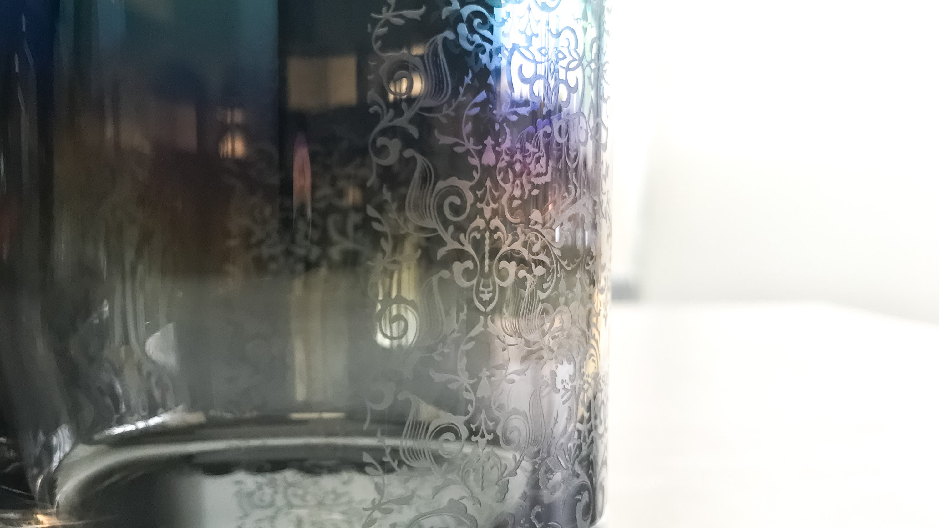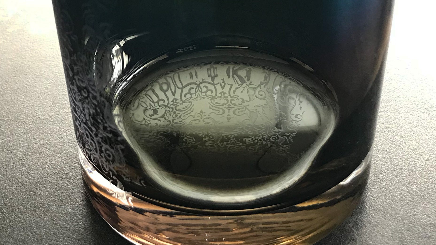 チタンコーティングのロックグラス に、職人がデザインを刻印した、クラウドファンディング限定仕様です。つるりとしたガラス面と、刻印の陰影。アシンメトリーな仕上がりをお楽しいただけます。