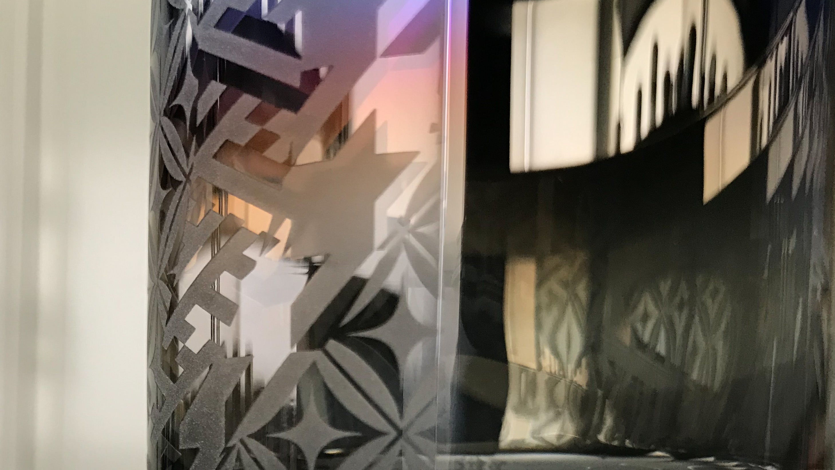 光量によっては、刻印したデザインをチタンコーティング越しに見ることができ、見る角度によっては側面のデザインが底面のチタンミラーに映り込む様子が見られます。