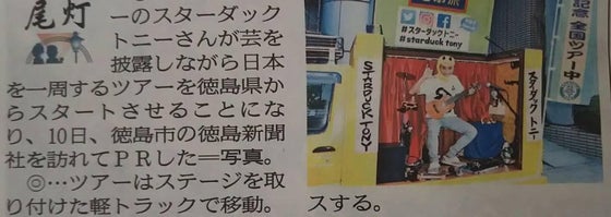 2017/08/16 10:59皆様のおかげでバスキングカーも完成し、徳島でのバスキングをスタートに、遂に全国ツアーが開始されました。(写真は8月11日の「徳島新聞」朝刊) 今後の活動は、スターダックトニーのTwitter、facebook、ブログなどでお知らせしていきます。いきなりあなたの街に訪れるかもしれませんよ! 引き続き応援のほど、よろしくお願いいたします。 もっと見る