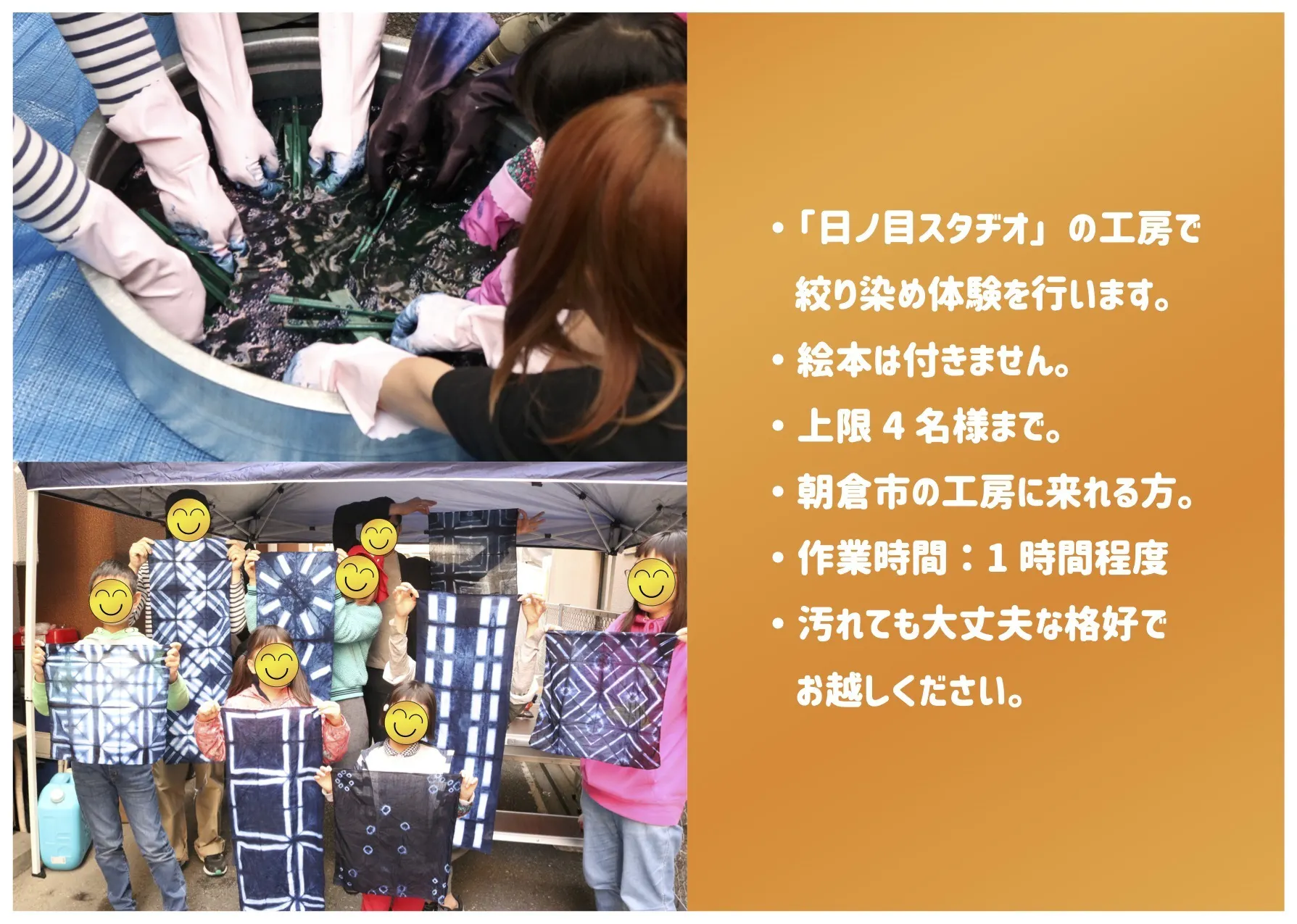※5月に工房を移転予定。新しい工房での絞り染め体験となります。