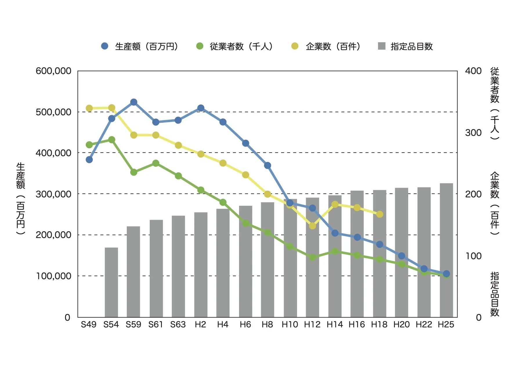 このグラフを見ても分かるとおり、生産額、従業者数共に年々減り続けております。