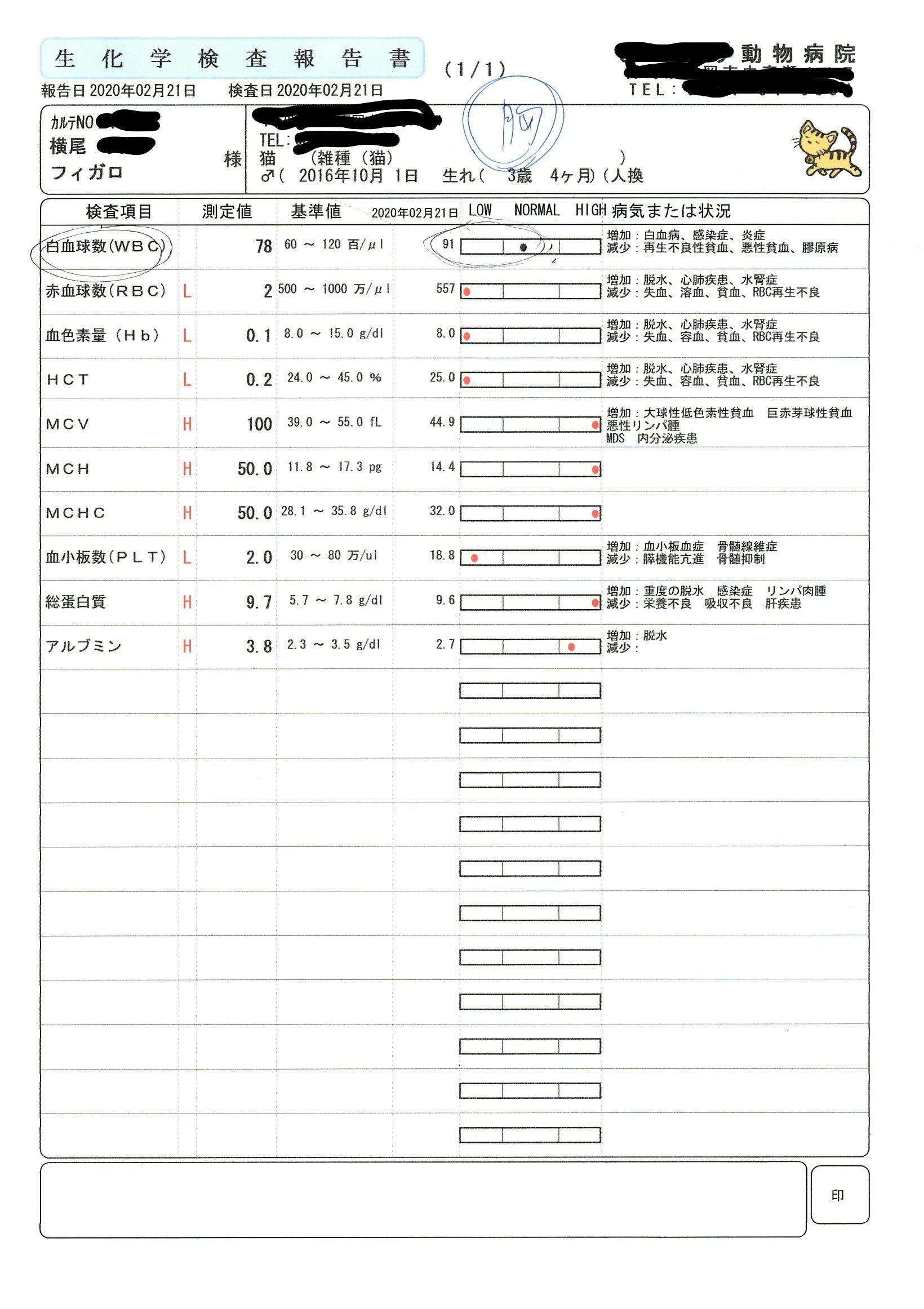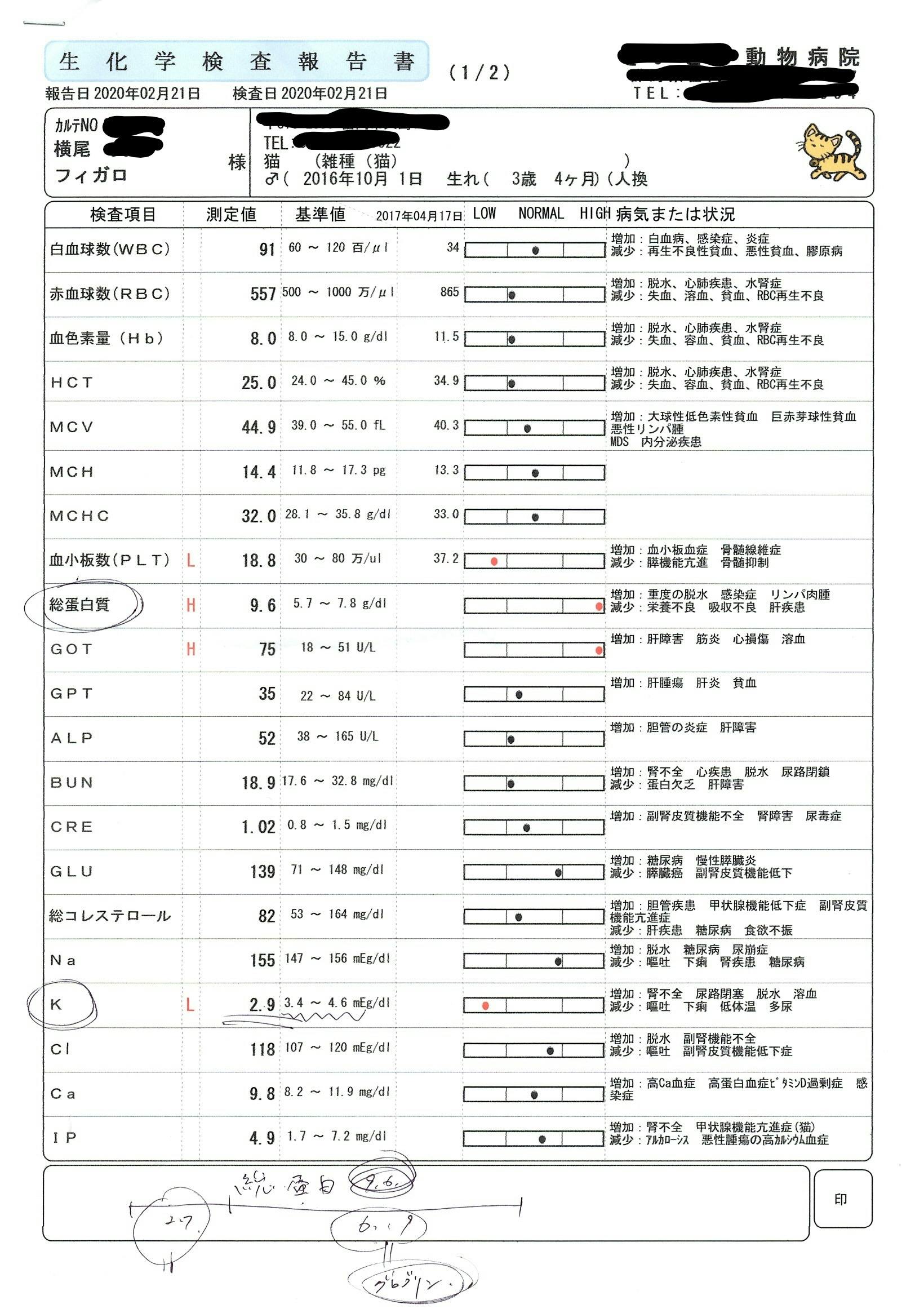 2020/08/20 19:31経過報告⑩!!寛解!!皆様、こんばんは。皆様にようやくフィガロの最後の経過報告をすることができます!まずは院内で行う血液検査の結果です。前回は高めに出てしまった数値は基準値内に戻りました。そしてA/G比は0.72と問題ない数値でした。最後の検査で良い結果が出たことでとても安心しました。そしてこちらが外注検査の結果です。こちらも問題のない結果となりました。これにて、フィガロのFIP治療は無事終了し、寛解を迎えることができました!!!皆様、本当に本当にありがとうございました!!血液検査の結果はセラーの方にも見ていただき「寛解です」と言って頂くことができました。投薬期間、経過観察期間合わせて約半年。とても長い長い闘いでした。投薬期間は上手に薬をあげることができなくて、毎日毎日泣きながらでした。フィガロもたくさんたくさん暴れて私にとってもフィガロにとっても辛い状況でした。しばらくすると、薬をあげること飲むことにはお互い慣れてきましたが21時になると投薬時間だと察して逃げ回り追い掛け回す日々。でも、どんなに薬が嫌でも、無理矢理私に口を開けられても投薬が終わった後は必ず甘えてきてくれる、そんな優しいフィガロに救われていました。経過観察期間は正直言って、投薬中よりも緊張の毎日でした。今まで薬で守られてきていたけれど、今後は何があるかわからないという恐怖がいつもありました。だから毎日フィガロがご飯が欲しいよと大きな声で鳴くときは心から安心していました。フィガロが病気になってしまってからご飯が食べられること、水が飲めること、走り回れること、トイレに行けること、甘えられること、大好きだよと伝えられること、ぎゅっと抱きしめられることがどれだけ幸せなことなのかを何度も感じました。その幸せはフィガロからだけでなく、皆様からもたくさんいただきました。FIP治療のためにクラウドファンディングを始め皆様に出会えました。そしてたくさんのご支援のおかげで治療を終えることができました。プロジェクト中も終了後もたくさんのメッセージに励まされ、何度も救われてきました。フィガロを応援してくださるメッセージも、私へのメッセージも全部私の幸せです。長くなってしまいましたが、今日までフィガロのことを愛し応援してくださり本当にありがとうございました。こんなにもたくさんの優しさや愛に包んでいただけたこと、絶対に忘れません。この報告がCAMPFIRE上では最後の報告となるかと思いますがTwitter、Instagramではこれからも時々フィガロの様子をお届けしますのでぜひ今後の成長を見守って頂ければ幸いです。本当にありがとうございました。2020.8.20 横尾・フィガロ もっと見る