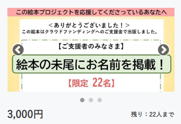 本日、11月24日(火曜日)20時30分より「絵本にお名前を掲載するコース」を追加リターンとして設定しました。価格は3,000円、限定22人となっています。(先着順)