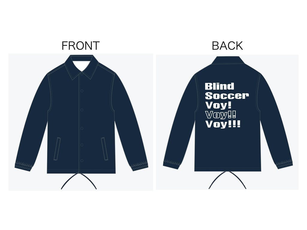 川後陽菜がデザインした応援コーチジャケットです。ブラインドサッカーの掛け声である「Voy!(ヴォイ)」をモチーフにしたデザインになります。