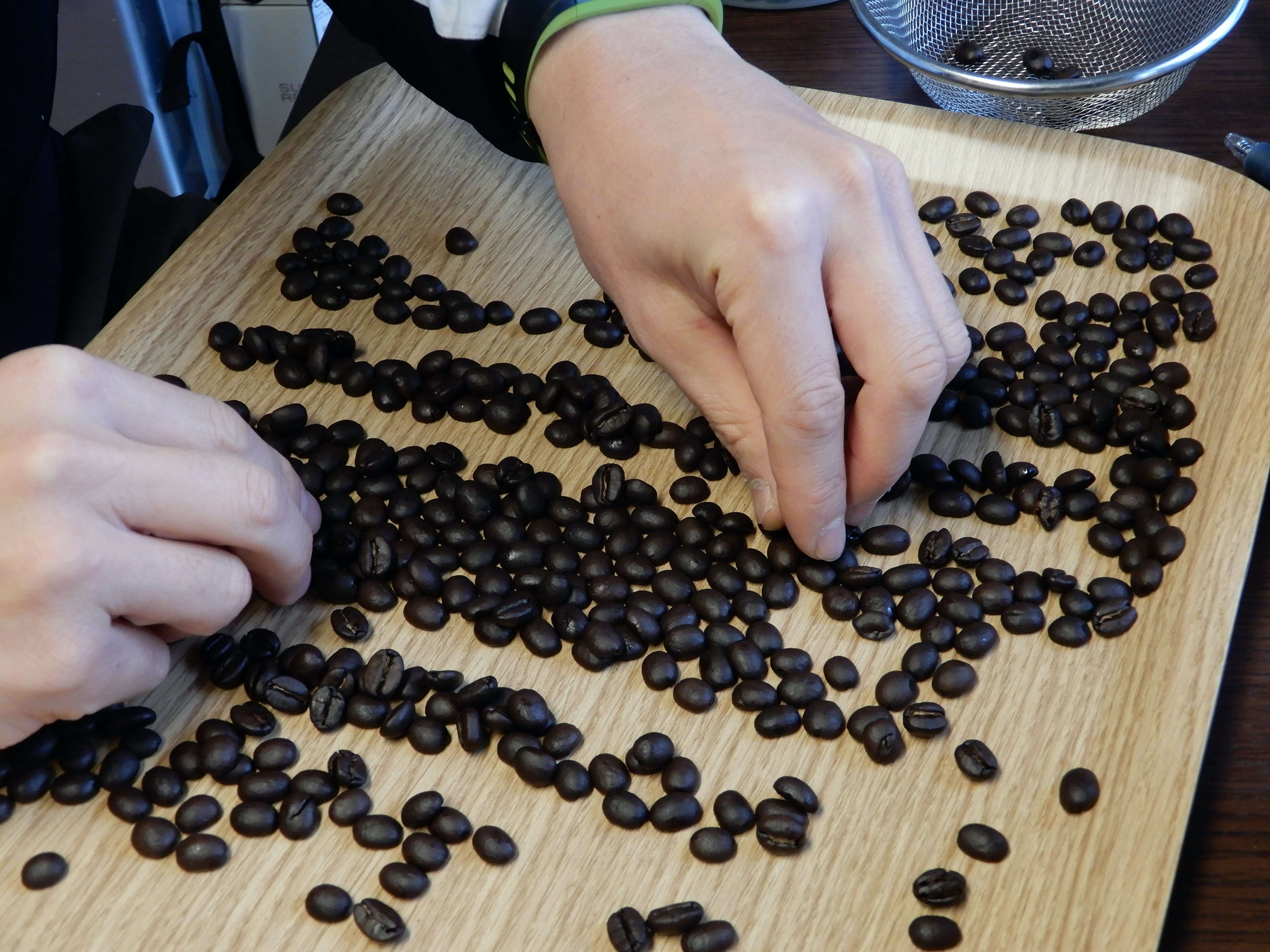 生豆のハンドピック同様、欠点豆を取り除いていきます。焙煎後の欠点豆は、主に味と見た目に影響する豆を取り除きます。