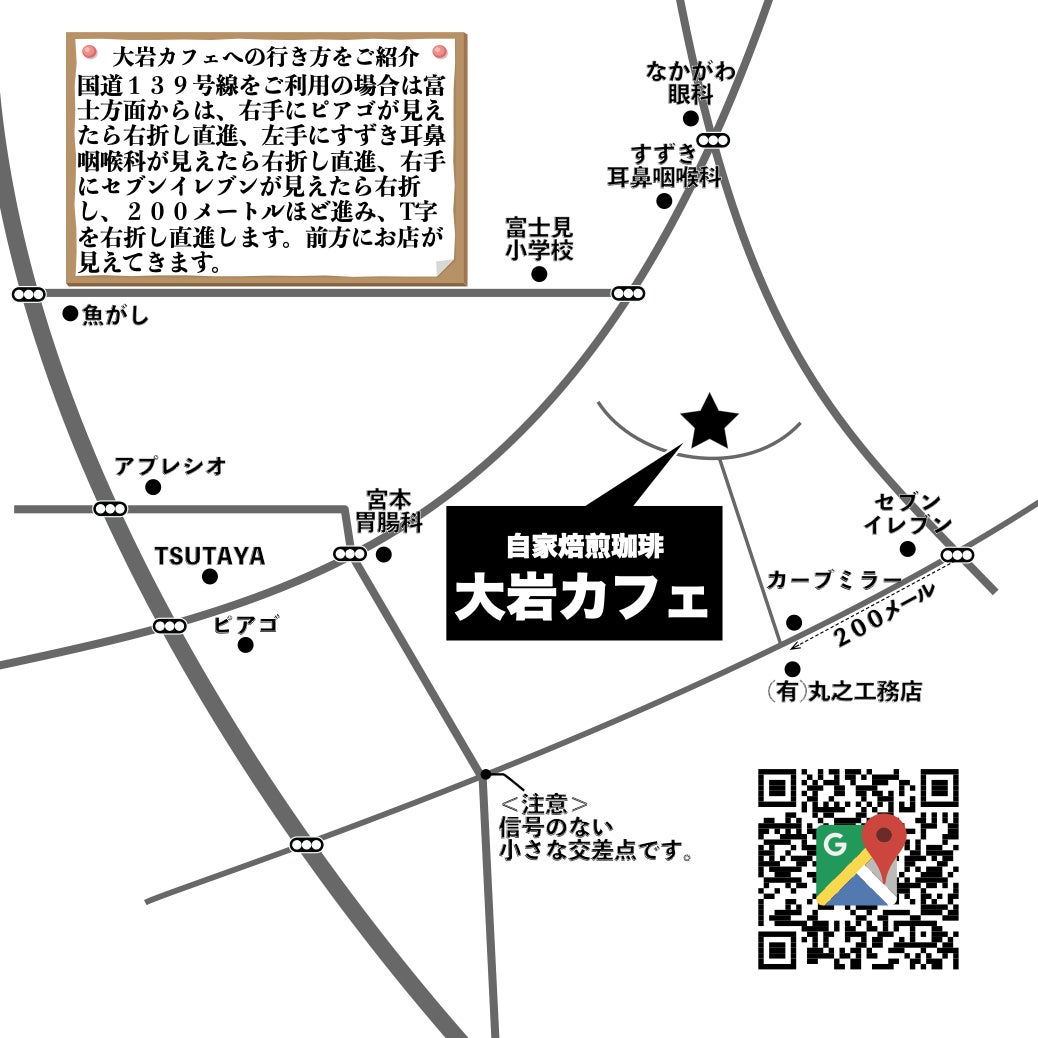 分かり難い場所ですが、静岡県にお越しの際は、富士宮市の大岩カフェへご来店ください。地図サイトですと、奥様のご両親が経営されております大岩溶接と出てきますが、その場所で間違いございません。