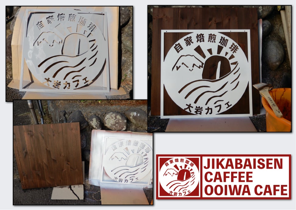 2020/03/27 05:42<看板作成>看板は作らなければなりません。看板はお店の顔となり、お店に来ていただく方々の目印となる大切な機能を備えています。いろいろなご縁の結果、ベースとなるところはステンレスで制作していただきました。これをどうやって活かすのかが、課題です。データ上での、大岩カフェのロゴの様にワインレッドで色付けしたいところですが、コストがかかるので別の方法を考える必要がありました。それでホームセンターをブラブラしていると、木工コーナーでなんとなくベースのサイズと合いそうな板が売っているではありませんか。サイズを確認すると500ミリ×600ミリとなっており、まあまあの感じでした。良さそうでしたが、ベースのサイズを確実に超えるにはもう少し大きい方が良いです。念のために隣の商品を確認してみると、600ミリ×600ミリではありませんか。即決です。そこで新しく塗料を準備しようか考えましたが、野外用の水性ニスが残っているのを思い出して、もったいないので残っている塗料を使用することにしました。ブラウン色なので、恐らく、そこそこの感じになるだろう、と想像しての決定です。工程は、ステンレスはサンドペーパーで細かな傷をつけて、中性洗剤で洗浄、乾かしたらサーフェイサーをかけて仕上げのサンドペーパーで表面の凹凸を無くし、カー用品の塗料を吹き付けて乾燥させました。板はサンドペーパーで表面をならしてタオルで軽くふき、水性ニスを全体に満遍なくハケで塗って乾燥。だいたい1時間半ぐらいの作業でした。出来上がりは、画像の通りですが、まだ固定していないので、重なりがよくありません。うまく重ねて、固定して、表に設置することになります。┏━━━━━━━━━━━━━━━━━┓┃ 自家焙煎珈琲 大岩カフェ ┃┃ 静岡県富士宮市大岩882ー1 ┃┃ (大岩溶接の敷地内) ┃┗━━━━━━━━━━━━━━━━━┛ もっと見る