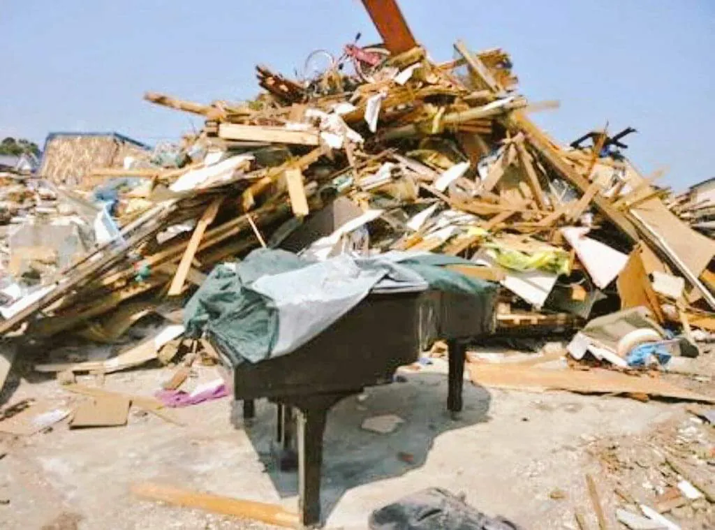 そしてあの日が来ました。2日後に見に行くと、実家の1階部分は潰れて数十メートル流されていましたが、ピアノ用に補強した床のおかげで2階は残り、ピアノは潮をかぶりながらもなんとか原型をとどめていました。しかし、そのときはどうする当てもなく、思い出に鍵盤1本くらいとって置ければいい、あとは家と一緒に壊してガレキとして処分するしかない、と思っていたのです。