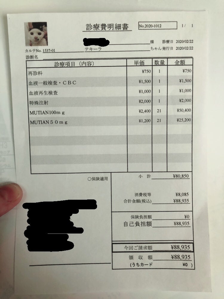 その他、再診料、血液一般検査・CBC費、血液再生検査費、特殊注射代(思いの外体調が良くなかった為)、合わせて合計88,935円(税込)になります。
