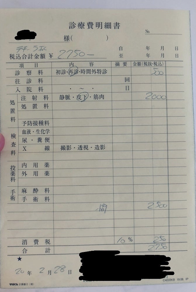 1回2,750円(税込)を2回受けたので合計5,500円になります。