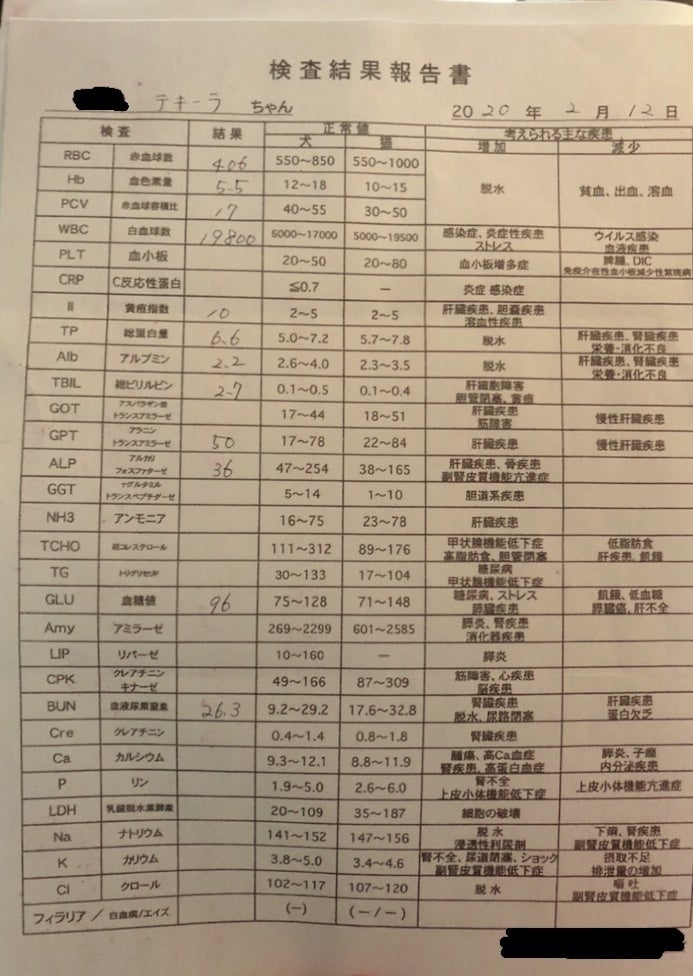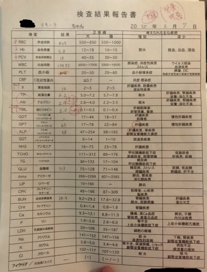 ⇒RBC、Hb、PCV、WBC、黄疸指数、TBIL、ALPが正常値外でした。